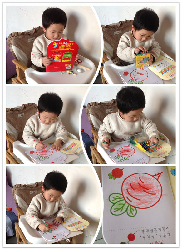 看小逗迫不及待的样子吧~~赶紧翻开涂色书选颜色啦~~ 涂色还带着那俩玩具,看见桌子上那俩玩具的身影没?那时候还没弄坏~~ 我选个红色,我涂大萝卜~~我再选个绿色,我涂萝卜叶~~ 看我涂滴怎么样啊??