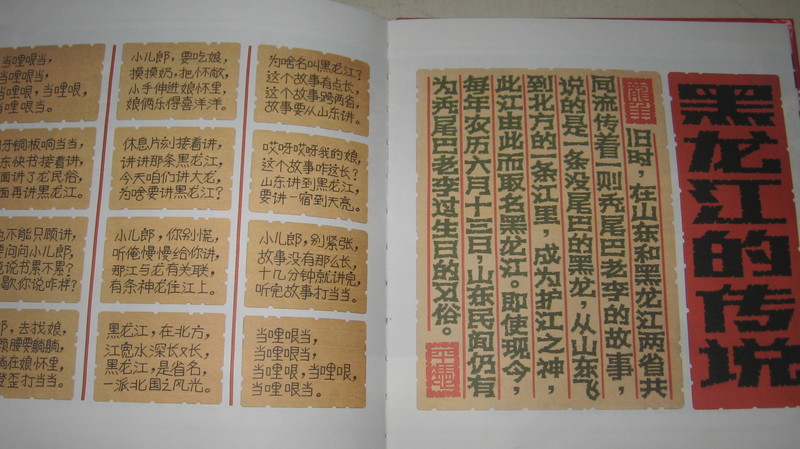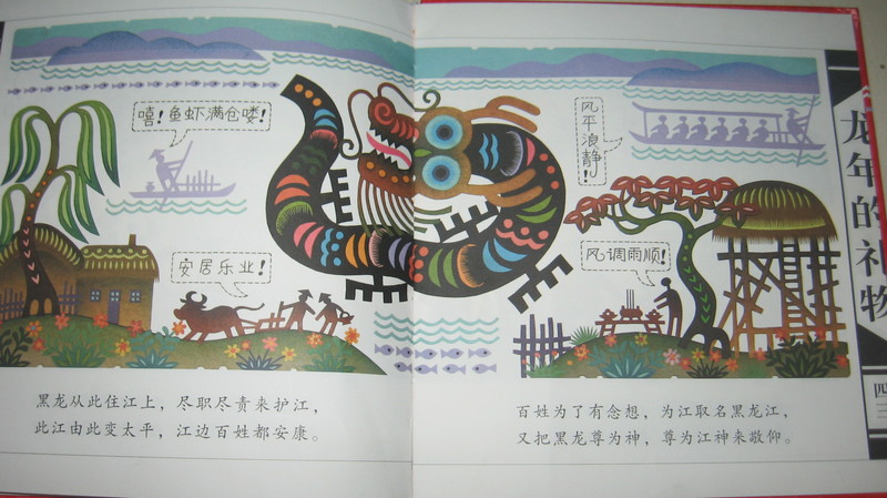 这种山东快板介绍的格式,读起来朗朗上口,很有韵味。。郎里根当,当里个当。.听着很熟悉吧。 还介绍了黑龙江的传说,很久很久以前。。。 话说北方黑龙江,有段故事长又长,山东胶东一村庄,李家姐弟住庄上 姐弟二人命真苦,从小没了爹和娘。 要知道细致的故事,大家可以借阅这本书看一下。。 黑龙赶走白龙,黑龙从此住江上,尽职尽责来护江,百姓为了有念想,为江取名黑龙江,此江从此变太平,江边百姓都安康,又把黑龙尊为神,尊为江神来敬仰。 读完这本书,真是先了解了黑龙江的由来和传说的,涵涵也是很喜欢看的,看了一遍又一遍的。这本书让孩子更多了解中国的民俗和传统文化,弘扬了中国的剪纸名族艺术,是一种喜欢的体现方式。 本作品未经作者许可不得转载,转载请征求作者意见。擅自转载使用,将保留追究其法律责任的权利! 评分记录