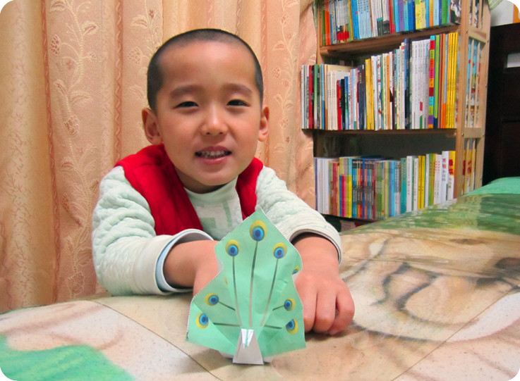 试验结束了,宝贝开始正式折。妈妈负责拍照,小家伙对应着分解图,一步步的折着!当然有时也会停下来问问妈妈,妈妈也会稍作指导,很快又一只漂亮的孔雀诞生了!就这样我们一共折了三只孔雀!争奇斗艳,美不胜收!快来看看我们的孔雀开屏吧!!