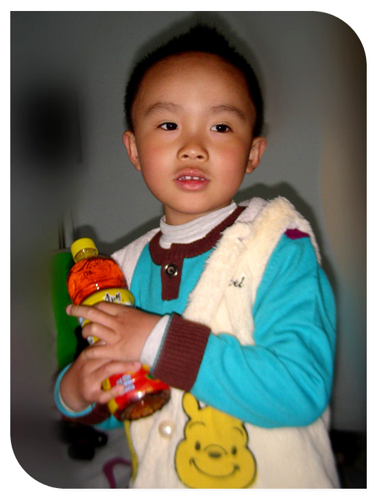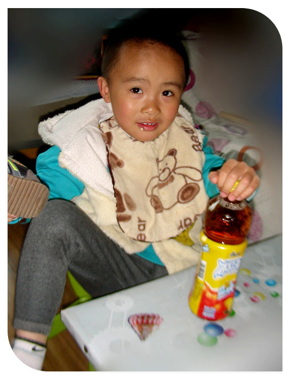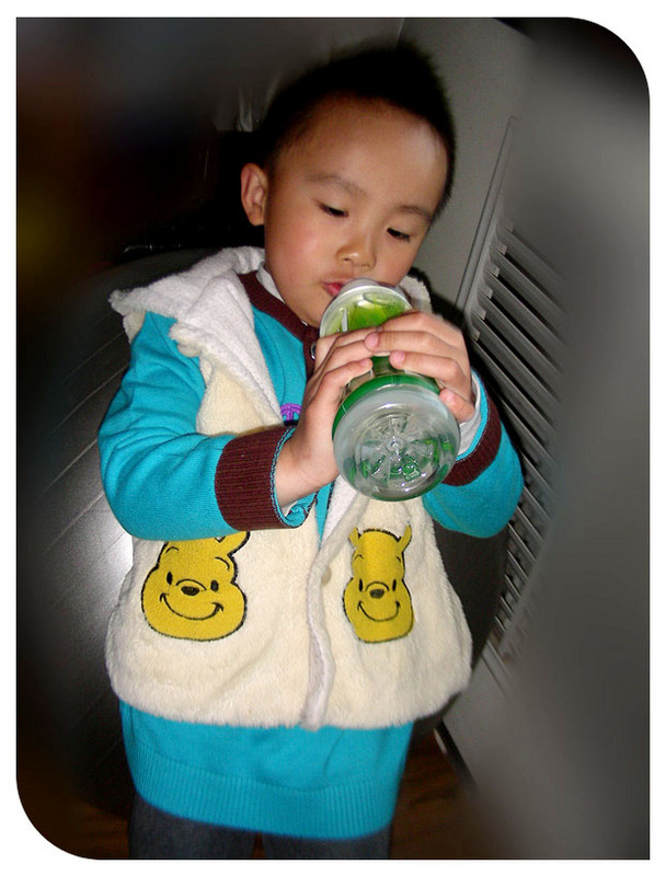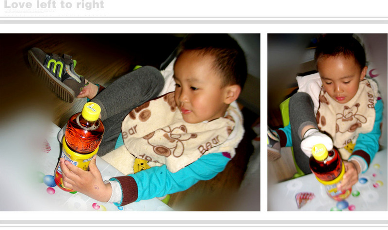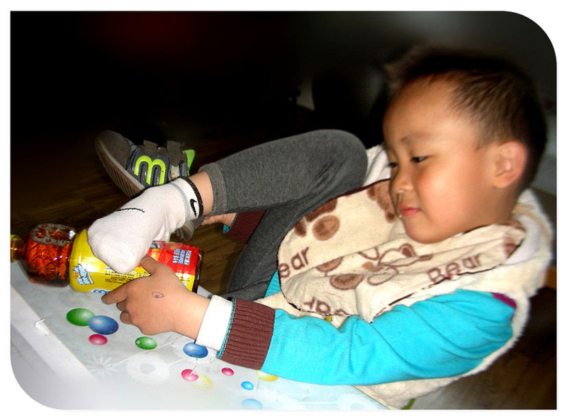 关于碳酸饮料这一块一直到现在为止对谦谦管的还是比较严的,家里不是过节的话也基本上是不买碳酸饮料的,从源头上就掐断。偶尔的聚餐时,小家伙也会喝上一些的仅此而已。这次谦谦之所以感兴趣就是好奇心在作怪,但是妈妈依旧坚持小孩不能喝的观点。谦谦在一旁有些闹腾,手里还在不停的摆弄着,看来还是不甘心。妈妈拿了一瓶“尖叫”递给小家伙告诉他这是他可以喝的,今天的运动量小不了,特意给小家伙买了瓶运动饮料来补充体力。岂料臭小子还看不上就是拿着冰红茶不撒手。过了一会当谦谦吃完鸡蛋羹的时候,好玩的事情发生了,只见小家伙对妈妈说道:“我要喝冰红茶了”,呵呵,估计你也打不开,妈妈也没搭理他。突然谦谦就脱掉了鞋子,(早上的时候突然要穿绿色的鞋子),拿着脚丫子在冰红茶的瓶子上蹭来蹭去的就当是喝上了,真是孩子的心里啊,估计还带点耍脾气的性质呢,妈妈只是看着没啥反应,小家伙倒是自己笑了起来。玩了一会后自己就拿起尖叫到一边假装喝去了......