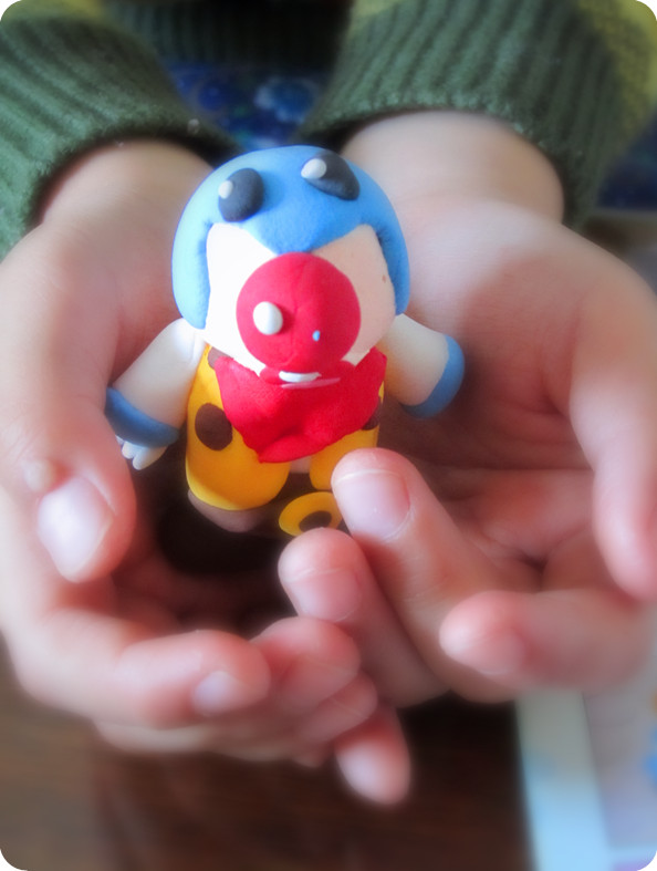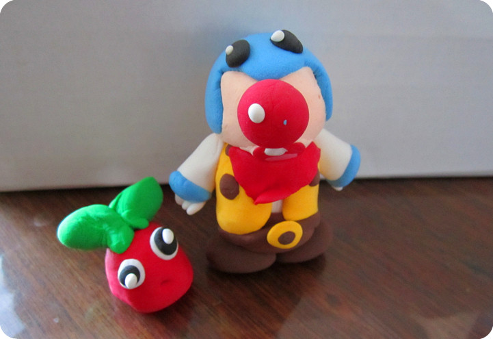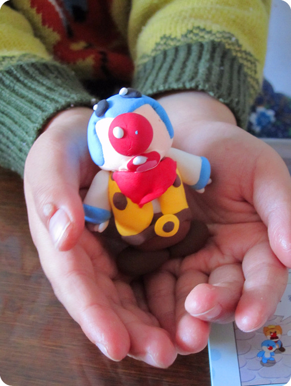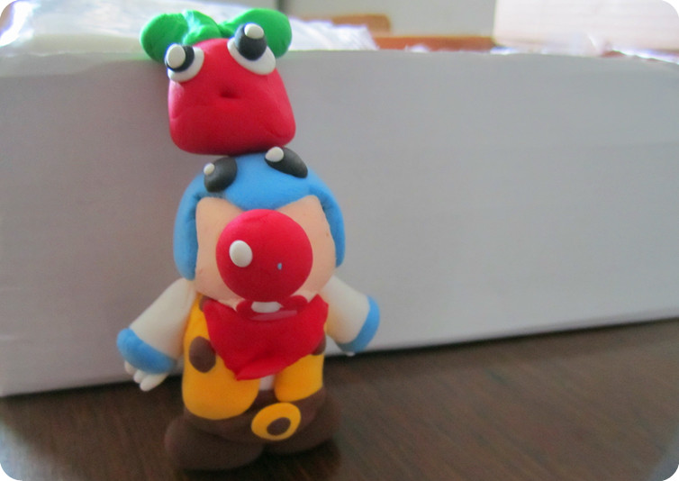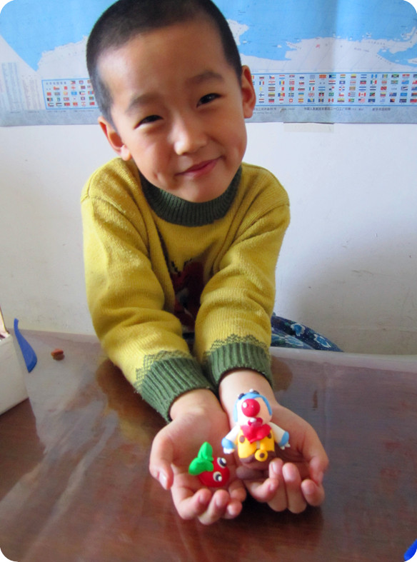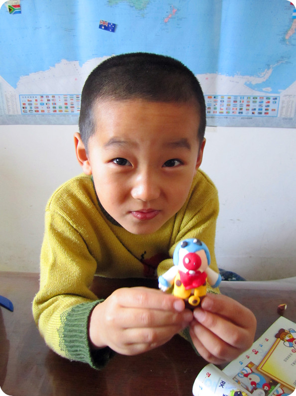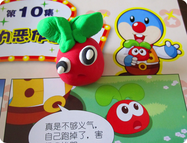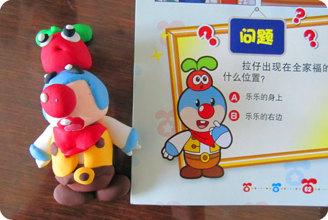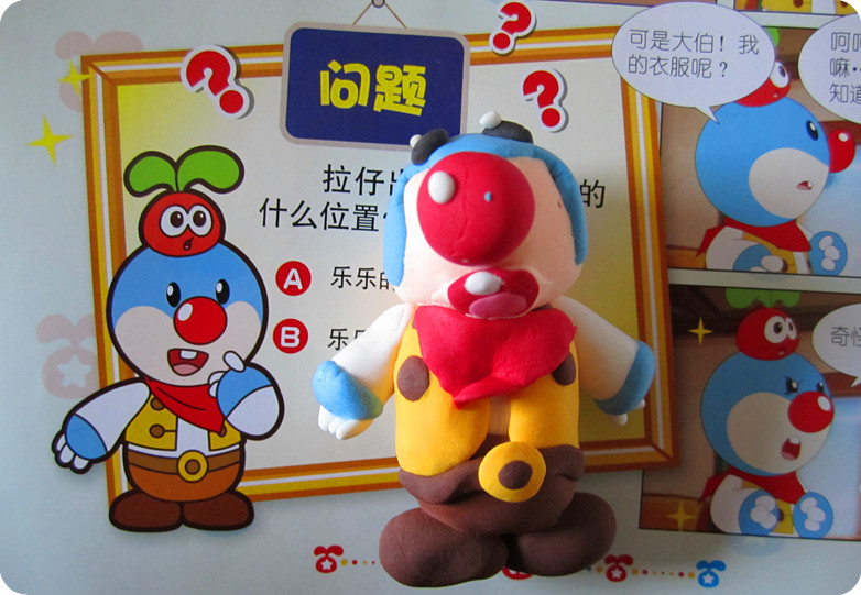 3D彩泥同橡皮泥,真的有很大的区别,易成型,好保存这些好处暂且不说,彩泥有一个小问题,让人很头痛,那就是太容易粘在一起,而且一旦沾上就别想把它们按原样分开,所以和小家伙玩的时候,了解到这个特性,我们一般就不会把没做好的东西往一起安,不会一边做一边组合,我们都是把所有的部件先做出来,再一起组合!可这样做也有缺点,那就是小部件容易干掉,干掉了就不容易粘和了!所以,我们的速度也要快,这次做的这个小东西里就有小部件干了,后来妈妈想办法给粘上的!呵呵……发现每次玩它都会总结些经验!呵呵……估计这样下去几次,我们的作品会越来越好的! ![]() 说了这么多,都没有说我们做的是什么?是什么呢?呵呵……是小家伙最近比较迷的一本漫画里的人物!不知道大家知不知道摩尔庄园,知不知道摩乐乐,知不知道一个叫拉仔的小宠物!这就是宝贝最近迷的漫画(当然也是一个动画片!不过小家伙是看漫画才知道的,现在也开始看它的动画片了!),而我们做的就是其中的主角摩乐乐和摩乐乐的宠物拉仔! 当你用彩泥做了很多次苹果、香蕉、冰箱、花朵……后,如果你做不出更有创意的东西,你会对彩泥也失去兴趣的!这可不是妈妈想看到的结果,所以寻找可以制作的目标就是我的责任!目光锁定了小家伙的漫画书!一个像苹果一样的小宠物,拉比!难度适中,小家伙应该可以完成!于是……