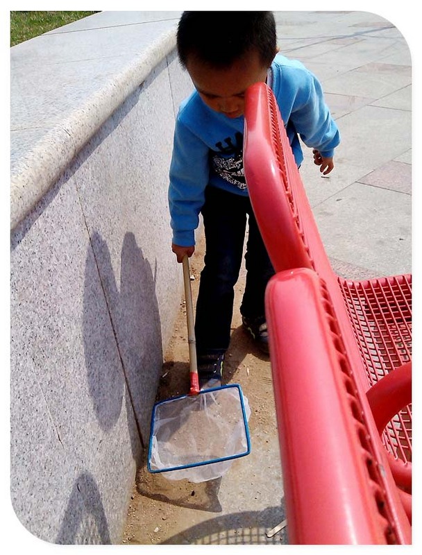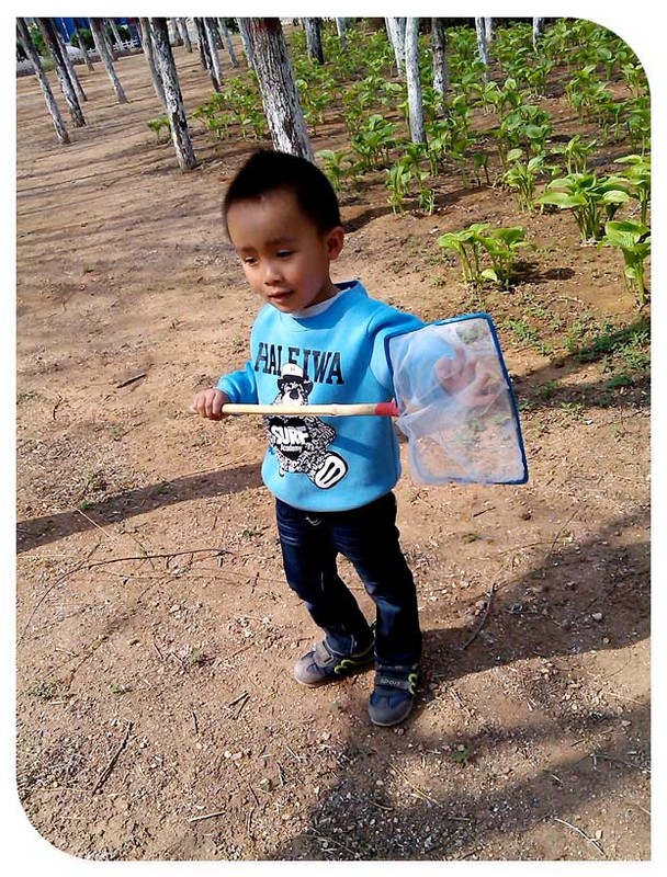 小家伙端着捞鱼用的网兜就进了树林中了,这喜鹊还真是有几只在地面上来回溜达的觅食呢,小家伙也不知道悄悄前进,拎着鱼网跑了过去,还未等接近喜鹊早就飞到高枝喳喳叫去了,小家伙还挺遗憾的。妈妈问谦谦知道要如何接近小鸟了吗?要慢慢走,轻轻行动,这小鸟的耳朵可是很灵的,稍微有个风吹草动的就跑了。后来小家伙也慢慢进入角色了,但是几次尝试均已鸟飞网空而告终。其实妈妈也知道这鸟那里是那么容易得手的呢,就是想让孩子自己体会捉鸟的乐趣,重要的是过程而不是结果。在说这个谦小子,鸟抓没抓到也不是很在乎,很快小家伙又有了新的猎捕对象,呵呵,树上有只小蜜蜂咧,也是可以用网扣住的哈,可是一网下去小蜜蜂还是飞走了。即便如此,谦谦还是没有放弃发挥网的抓捕功能呢,换个地咱接着扣去。拎着鱼网小家伙又追随蝴蝶到了草地上,然后又去了一个健身广场,一路追逐小家伙也累了,刚好旁边有椅子坐下歇会喝点水吧,就在此时突然发现地上有只虫子,当然也是不能放过的,扣住了,哈哈......