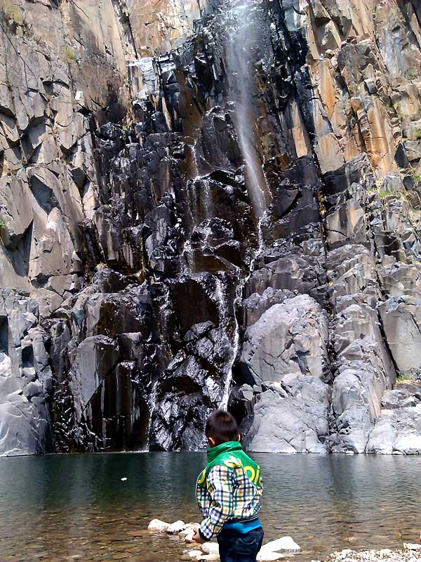 “九道缸”是上个周末一家三口出游的地方。来此地纯属突然决定呢,就因为网上闲逛看到了该景点的团购票还算优惠,20多元钱,另外就是数年之前来过此地,对瀑布的感觉依稀还有些记忆,所以当机立断带着谦谦和老公周末来一趟。想法不错,但是路途不顺啊,途径好几处修路地段,除了堵还是堵,一个小时的路程用了2个小时才到达。更无奈的是我们没有直接到达景点板厂峪的入口,导航直接导到了南门,而此处距离九道缸是最近的(九道缸是板厂峪内的一个景点),所以团购的板厂峪门票先玩的景点就是九道缸...... 九道缸顾名思义就是9个水潭连接,第一次听着名字的时候也觉得奇怪,为什么叫缸呢,够直白的感觉。九道缸最精彩的地方当属九道缸瀑布了,九道缸瀑布从头道缸到第九道缸总落差为126米。其中落差最大的也就是现在我们可以看到的第九缸,它的落差69米,瀑布下潭水清澈见底,碧绿如玉。瀑布在丰水期水流巨大,水声隆隆,形成二。三米宽的水帘,当你站在潭边向上仰望时,就会感到天生瀑布有如拔地而起,直冲九霄的感觉。大概是我们来到时机不对吧,这样壮观的景观并没有欣赏到,但是有落差的瀑布让孩子欣喜若狂此乃足矣......