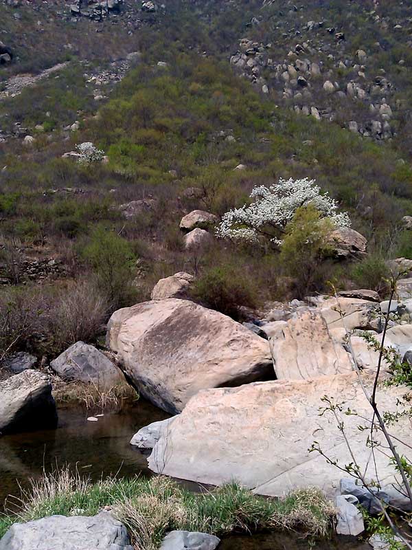 看着路况就知道此行不易啊,首先我们就多走了一段冤枉路,最后还是询问当地人才走到正确途中的。其次真是难走啊,到处都是石头,此处景致也是山石林立,突兀、还带着点苍凉。绿色也有但是不够葱郁,偶尔还能看到一两株梨树,梨花开的正旺。看来要到达目的地还真是要多加油啊,谦小子表现还不错,找了根长棍子走的倒是也稳当......