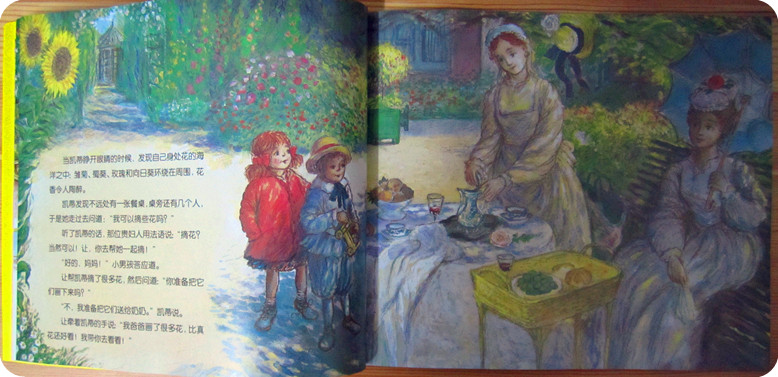 凯蒂和小男孩让,成了好朋友,他们一起在花园里摘花,一起去男孩父亲莫奈的工作室里画画。他们玩得好开心,直到凯蒂要回到奶奶身边去了。
