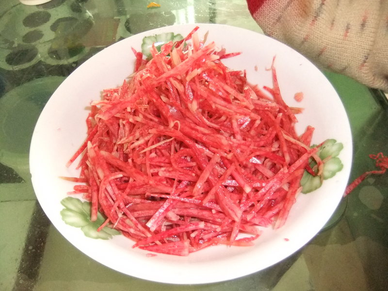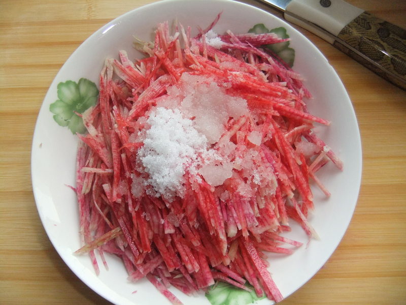 春天气候一般比较干燥,人们易发呼吸系统疾病,特别是小孩子一旦咳嗽起来往往不会咳痰,妈妈也都听说过萝卜是很好的化痰清肺食品,可是萝卜天生有一种辣的味道,小孩子都不太爱吃,如何让孩子爱上萝卜,于是我给宝宝做了一道“糖醋心里美”。 “心里美”是萝卜中的一个品种,因为汁液中存在花青素所以会呈现一种紫色,这种色素在酸性溶液中颜色偏红,这种颜色会让人看起来特别有食欲。 将买好的心里美,洗净,去掉外面的绿皮,然后切丝 装入盘中,放上白糖和白醋 这时萝卜丝立刻变成了红色,色彩十分诱人 一看到拌好的萝卜,宝宝立刻自己“开动了” 本作品未经作者许可不得转载,转载请征求作者意见。擅自转载使用,将保留追究其法律责任的权利! 评分记录