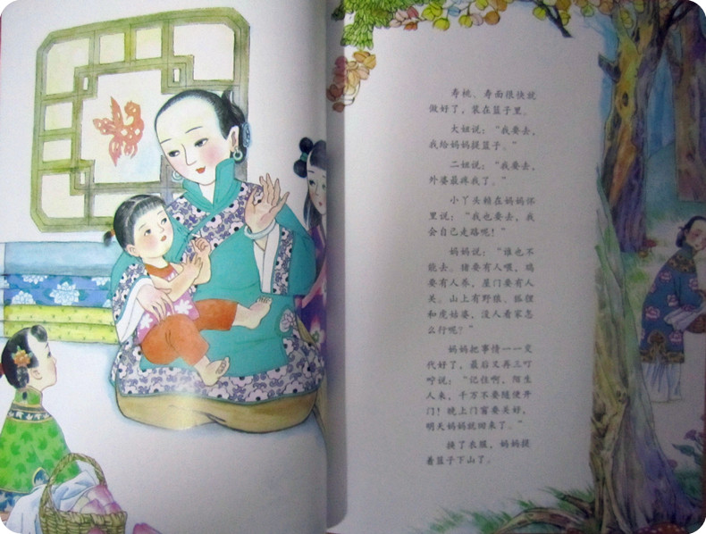 虎姑婆很容易找到了三姐妹的家,敲了敲门,喊着姐妹们来开门。大妞、二妞都不相信她,都没有开门,只有小丫头受了虎姑婆的蒙骗,给她开了门。随着故事情节,心情一下子紧张起来,怎么就这么随便的给开了门,多危险啊!可回头想想,若是自己,一个妈妈的声音在呼喊,又能有几人能完全的不相信呢,何况还是一个孩子。