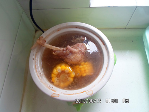 端午节的时候回妈妈家,妈妈送了一只正番鸭,还有半只没煮,10点多的时候我就从速冻里取出出来,放在电炖锅里炖,还加入了玉米,莹莹挺喜欢吃玉米的,一天可以吃一大条的玉米哦。回到家的时候已经12点了,再炒个菜就1点了,那鸭肉也煮熟了。我就打开盖子,把锅里上面的那层油用汤勺捞出来,这样汤喝起来就不会那么的油腻了。