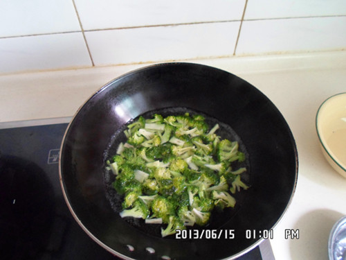 莹莹特别喜欢吃青花菜,但是她只要吃那个花蕊,因此我就投其所好的,就把那个菜梗与花蕊分开,用刀把菜梗的那层老皮去掉,然后再把花蕊切得小小块的,洗干净后先放入锅里焯一下,加入适量的油才不会变黄。水开后滚几下再捞出来。把锅里的水倒出,热锅后再加入适量的油,加入切好的红萝卜和蒜头再翻炒一下,加入适里的盐巴和鸡精就可以出锅了。