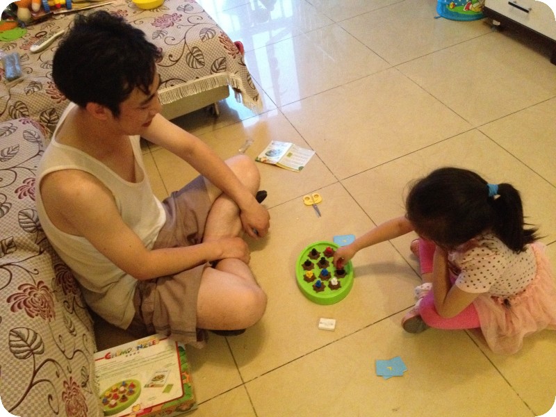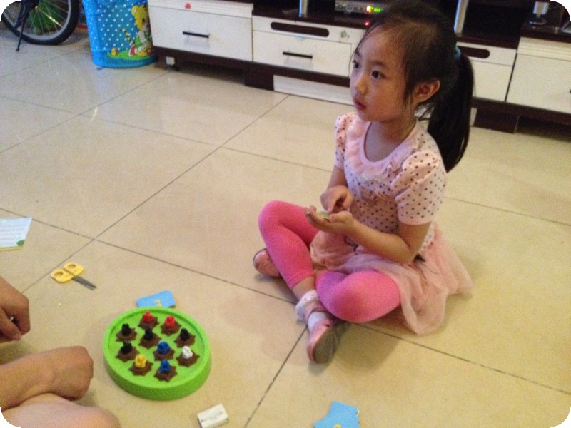 这是一盒记忆游戏玩具,贝爸给她讲清楚游戏规则,两个人玩了几盘。相对来说,这个玩具她还是很喜欢玩的,不过在和我玩的过程中,还是因为规则的问题哭了几次,而我坚决不让步,因为规则就是这样,你不清楚可以问,但是绝对不可以耍赖!