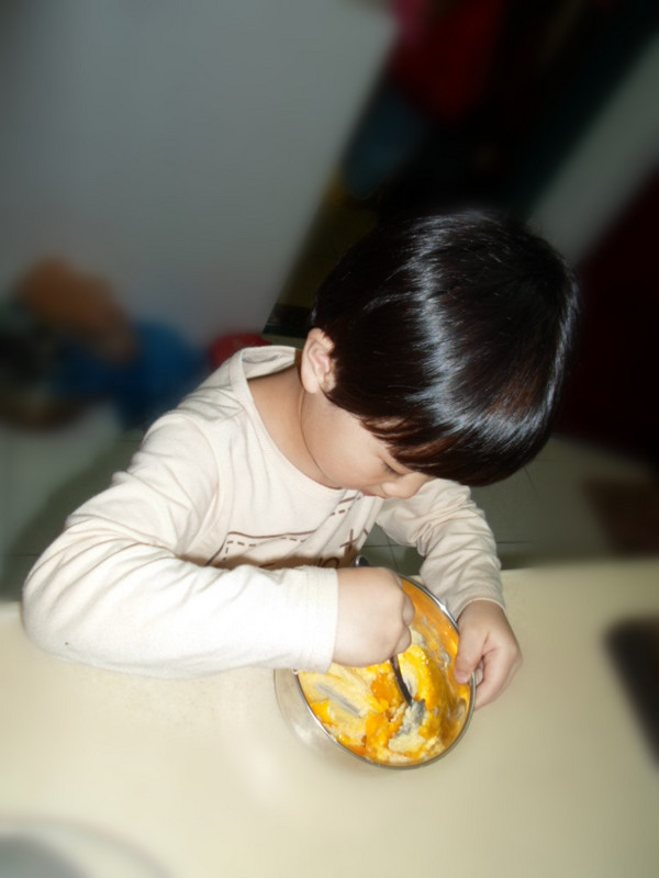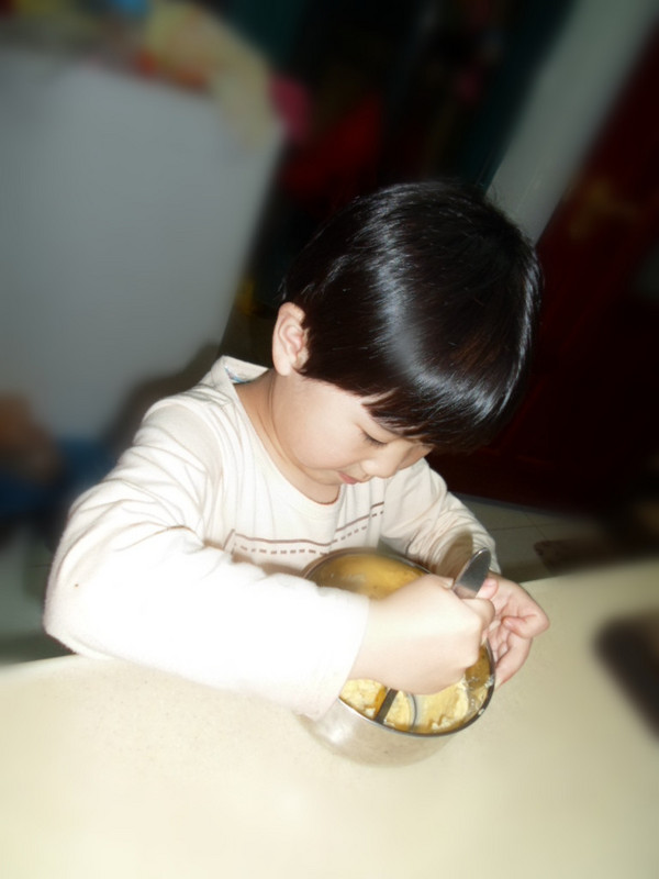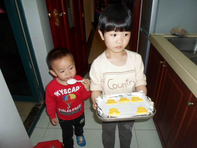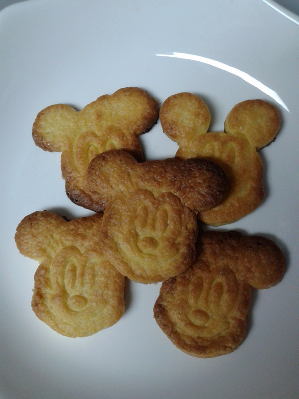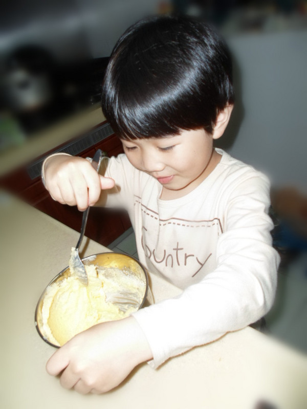 ![]() 这次制作饼干应该有一个月以前了,一直都没来发贴,今天把照片整理下还是发上来大家分享下. ![]() 买了烤箱后就买了一个米奇和一个米妮的饼干模具,想着做些可爱造型的饼干来给小家伙们吃. ![]() 那天从网上看了下曲奇饼干的制作原料和工序,开始照葫芦画瓢,没想到结果还出奇的成功,米奇造型的饼干做出来啦!小家伙们吃得特别高兴,不过因为用造型做太慢了,刚好那会又差不多快点晚餐时间,所以只做了五个试验,其他的原料都按照做蔓越莓饼干的程序放冰箱里冷冻后切片烤了,后面的就做了一些普通的块状曲奇,不过虽然样子很普通,但味道那叫一个美味啊!有机会的亲们可以去试试啊! ![]() 下面来说说制作过程吧! 准备原料: 1:低筋面粉:185克. 2:黄油:100克. 3:蛋黄:1个. 4:白糖:70克,(百度是说要放100克,我把量减少了,不想让孩子们吃得太甜.其实减少后烤出来的甜味刚好.) 5:水:5ML.(这里也没什么严格要求,只是到最后和出来的如果太硬了可以稍微加点.) ![]() ![]() 步骤: 第一步:黄油软化后加入白糖搅匀. 第二步:加入蛋黄搅匀. 第三步:加入低筋面粉搅锐匀. 第四步:加水揉成面团,静置15分钟. 第五步:开始做造型.我做的时候是按照坨上次去饼干店做的时候那样的,把面团放在保鲜袋里面,然后用擀面仗擀成大概3毫米的厚度,开始用模具印制. 第六步:放烤箱里烘烤,我这个烤箱是大概烤8分钟就搞定了. 下面来看照片吧! 软化后的黄油加入白糖. ![]() 坨一开始就说要来帮忙了,所以这个制作过程,小家伙一直帮妈妈搅拌,这里是第一步在搅拌黄油和白糖. ![]() ![]() 完成第一步后,加入蛋黄. ![]() 又开始搅拌. ![]() 加入低粉. ![]() 再搅拌出来就是这样效果.(里面还加了一点点水.) ![]() 静置后入在保鲜袋里面擀平. ![]() 剪开保鲜袋,用模具造型.(取下外形,然后再把模具的另一个配套的印出米奇的脸.这里没拍到照片) ![]() 成型后装入烤盘放入烤箱. ![]() 烤制过程. ![]() 出炉咯!米奇和米妮的造型还是挺逼真的,呵呵! ![]() 剩下的材料没再继续造型了,而是整成条状形放冰箱里冷冻了一小时. ![]() 切片后直接放烤箱烤. ![]() 烤出来后味道也是很不错的. ![]() ![]() 看两小家伙的吃相就知道有多美味啦! ![]() ![]() 完 本作品未经作者许可不得转载,转载请征求作者意见。擅自转载使用,将保留追究其法律责任的权利! 个性签名