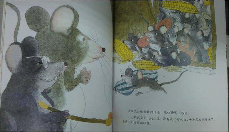 从最初听妈妈讲老鼠嫁女儿的古老传说,到后来能够自己背诵“两只老鼠来吹号,四只老鼠放鞭炮,八只老鼠抬花轿,老鼠嫁给了大花猫”,再到现在看绘本赏图画听故事,对这些小老鼠,大宝真可谓是“读你千遍也不厌倦”!大概孩子在幼年时期,就是愿以各种方式来反复演绎同一体裁,以此来加深印证同样的快乐和满足感吧。 让我们启程吧,顺着箭头指示的方向,我们来到了第一辑 中国民间童话,第八本《老鼠嫁女》,大宝娇笑道:“妈妈,应该是老鼠嫁女儿。”“女是女儿的简称,古人习惯以女来指代女儿,比如木兰辞里面,问女何所思问女何所忆女亦无所忆女亦无所思。”“妈妈我知道,快快往后看。” 第一页是个引子,讲除夕夜过大年初一初二玩个够,到了初三就要早早上床睡觉,因为初三晚上有一件大事要发生哦。我还在卖关子,大宝说:“老鼠要嫁女儿了!”对,故事情节我们已经了如指掌,来欣赏图画:右边怎么一个胖乎乎的小老虎啊?哈哈,那是头戴虎头帽,脚蹬虎头鞋,裹着厚围巾,手提红炮仗的小娃娃!虽然只是个背影,但是看起来虎头虎脑好可爱!而牵着“小老虎”的妈妈,相比之下身形高大,只画出了蓝布裤子和鞋子。 为啥人物都以半身背影出镜呢?那是因为主角是左边的老鼠们呀!看它们一个个忙得不亦乐乎,高兴的连蹦带跳,那贴着大红双喜字的轿子,那噼里啪啦的炮竹,那长长的红绸子,圆圆的锣鼓,一派旧时热闹婚娶的盛况! 下一页,就是老鼠的正面堂屋了,房梁上悬挂着的玉米,绿灯罩掩映着黄灯泡,木盆,搓衣板,肥皂,小板凳,木床头,亲爱的爸妈,好一个温馨暖暖幸福殷实的家!爸爸半坐在床上,被子上摊开一张《鼠市日报》,妈妈系着白围裙,一个在看报,一个在洗衣,但是它们的眼睛啊,都在望着闺房里对镜贴花黄的女儿!拳拳爱女之心满溢!天下父母心都是一个样啊,爱女心切的老鼠爸妈,要为闺女选个好夫婿。 它们拄着棍儿,拎着包袱,踏上了给闺女找幸福的漫漫旅程。烈日下妈妈汗珠滚落,乌云下爸妈淋湿了全身,大风吹散了爸妈的行李。 虽然一次一次的被拒绝,但是老鼠爸妈矢志不渝,一边担心一边继续找围墙。大宝注意到在找到围墙的时候,老鼠爸妈已经累得气喘吁吁,疲惫不堪了。画家画得太传神了,把这颗为人父母的心画得连孩子都能体会得到。 大宝说:“妈妈,他们为什么要拄着拐杖?” “一方面因为爸妈年事已高,另一方面也衬托旅途的艰辛。” 围墙给出了最终答案“虽然我可以挡住阳光,挡住大风,但是你们老鼠在我身上打动我没辙啊。老鼠是最伟大的,何不找个老鼠做女婿呢!”老鼠爸妈点头称是。 当这个消息传遍鼠国,年轻的小伙子们争先恐后踏破门槛的赶来,还带着最好的礼物哦:玉米,土豆,花生,红薯,山药! 接下来这一幕令我感动不已,老鼠小姐娇羞的躲在窗帘后,开始抛绣球啦,台下老鼠人山人海啊。“王孙公子千千万万,绣球单打薛平郎。”老鼠夫妇终于选到了好女婿,正月初三,吉日成亲,好热闹! 大宝惊喜的说:“没有嫁给大花猫呀,太好了,老鼠没有被猫吃掉!”感谢谢武彰先生一改传说中老鼠被猫吃掉的悲惨命运,给了一个如此圆满的大结局。 以往的版本中,更侧重取笑老鼠的愚蠢虚荣无知,而在本书中,我们感受到的,却是老鼠爸妈的一片爱女之心,以及老鼠女儿找到如意郎君的幸福。 以下是大宝有关该绘本的日记: