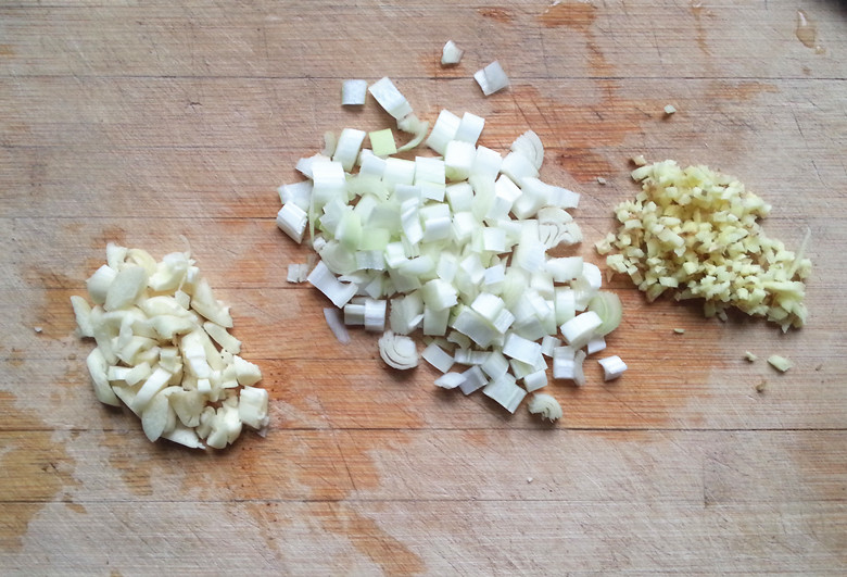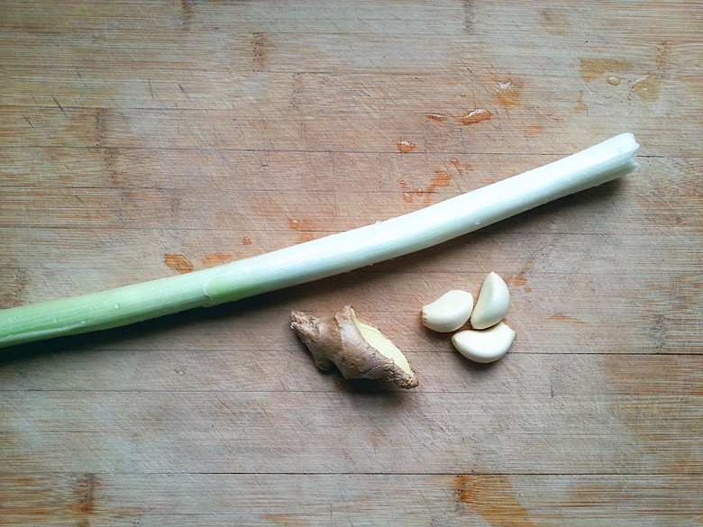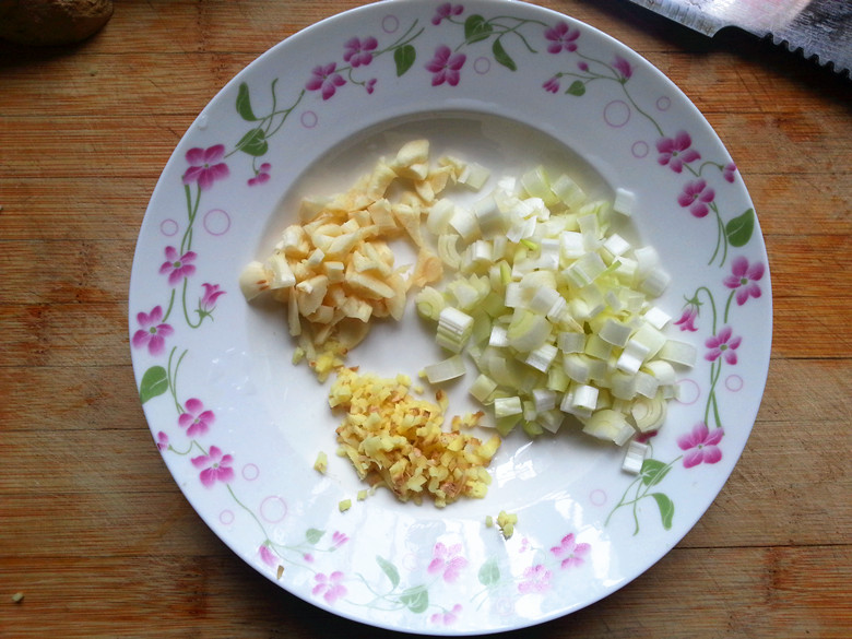 葱姜蒜上来~~~拍个皂片啦~~~ 将葱切成葱花,姜和蒜切沫~~