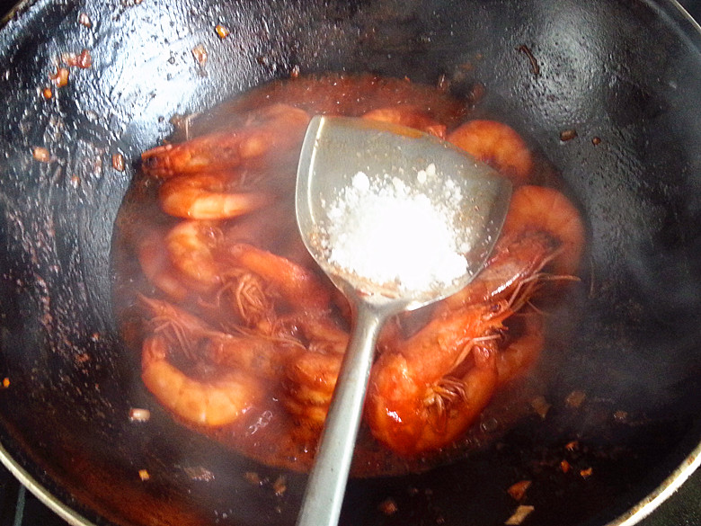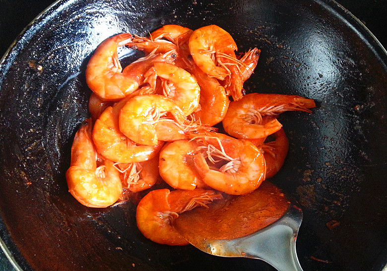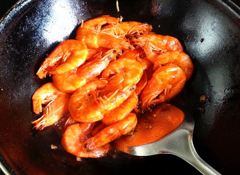 那就是因为我们将虾黄保护的好的缘故啦~~我看有的介绍做油焖大虾要放番茄酱, 他那估计是想要个漂亮的颜色吧~~咱们这个是不是完全没有必要啊?? 翻炒一会儿,将虾米盛出来~~