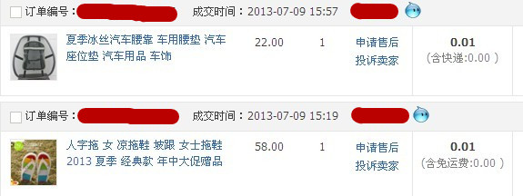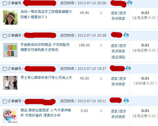 前几天淘宝上又在做活动,只要你在他的店里买过东西,就可以直接免费抽奖的,或者是收藏了店铺的也可以直接抽奖的。活动进行了两天,奖品大多为什么VIP卡,3元,5元,10元,20元的优惠卷,有50和100的,但那种的商品的价格都是好几百的,就没什么意思的。![]() 由于我们都没什么经验,在第一天参加时抽中了两个实物奖,后面就没有去抽了,其实还有机会的。 先给大家看看我第一天的站果吧 车用腰垫是在50份名额里面的,这个就直接送我朋友了,昨天都收到了,说是他老公已经用在车上试过了,非常满意。 ![]() 这是我朋友抽中的实物奖,她不喜欢,就转送给我了,据说是925银的。其实我喜欢的是这个吊坠,紫色的 ![]() 其实紫色没有这么深的,拍照技术有限,呵呵 ![]() 一分钱的摇摇拖鞋,卖价是29,去年我曾经买过这种的,好像也是29吧,原来那双是买小了,给我妹妹了,没想到这次竟然免费抽中这个,这个是在100份名额里面的,而且我中奖号,告诉我朋友,我有4个朋友也都抽中了,看来我还给大家带去好运气哦,哈哈 ![]() 店家还很贴心的专门问我要多大码子的,什么颜色的,态度是非常好呀。本来想收到后给个好评的,没想到,只要是这种活动奖的都不用评价的,看来淘宝是早就设置好了的。 ![]() 而且这个还是发的EMS,没想到今天中午就收到了,真是速度呀。 还很意外的收到小礼物,还有双可爱的船袜呢。美死了。 ![]() 这是第2天的站果,就早上抽了一个,下午有事情出去了,晚上在接着抽了3个。由于都还没收到,只能给大家看这个截图了。 我也简单说说这些奖品的来由吧; 帽子是一个群里的朋友在说,给大家的连接,我一进去就抽中了。哈哈,虽然我已经有很多帽子,但都没这个超重吧,而且意义不一样的。 第2个的是钥匙包,家里本来有很多,但一分钱的怎么也要的 第3件是男老背心,这个可没有客服来联系问要多大码数的就直接发货了,不过也无所谓了,反正一分钱,到时谁能穿就给谁穿,实在没人能穿,当抹布也可以的,哈哈 第4个是个可爱的折叠杯,不用时折叠起来,主要是好玩,新鲜,罐罐看见就想要这个,哈哈 由于我们明天就出去了,这些没有收到的东西就寄我妹妹那里,因为我妹夫在家的,而且她们楼下有门卫的,很负责的。如果寄我家,因为罐爸要上班,只能下班回来后去别人那里取,始终不是很好。 ![]() 另外这件衣服是因为有20元的优惠卷,正好看见这衣服在打折,才22,用了卷才2元,马上就拍下来了,送我妹妹了,因为我穿不了,只能给我妹妹穿,这样正好何乐不为呢。呵呵 ![]() 而且运气比较好的是,我的这些东西全部都发货了,只是收到的时间的早晚而已,因为我听别人说,她们很多都没有发货,说是这样那样的原因和借口。看来辛苦付出还是不错,有收获。呵呵 本作品未经作者许可不得转载,转载请征求作者意见。擅自转载使用,将保留追究其法律责任的权利!
