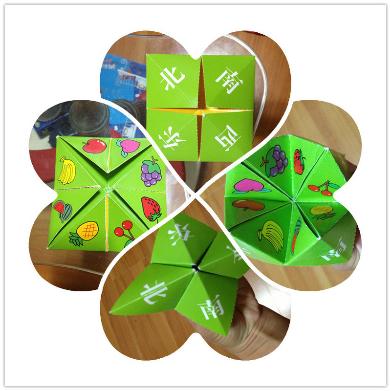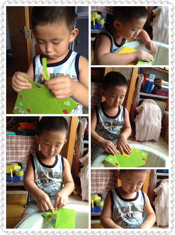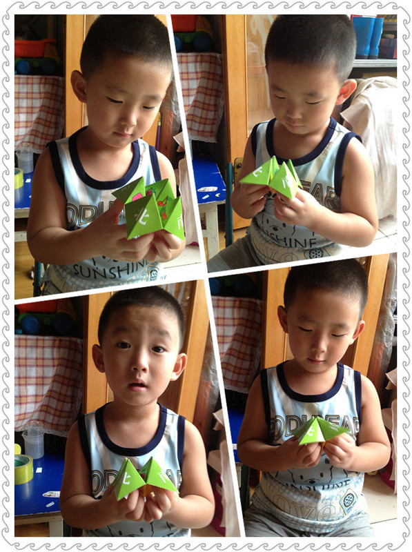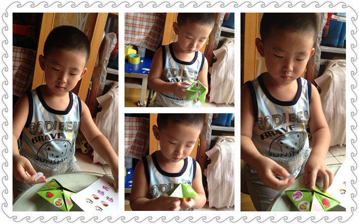 ![]() 做一部分综合性的题目,最后一道题就是做手工,手工的名字叫东西南北。相必妈妈们都应该对这样的一种游戏也好叫玩具也罢不会陌生吧。 ![]() “这是由一张正方形的纸折成的,折完后,外面有四个正方形,上面分别写上东、西、南、北,在里面有八个三角形,分别写上各种不同的名称,玩的时候,操作人用两手的食指和拇指分别做并拢和张开的动作,问对方要哪儿?几下?假如对方说要东,三下,在手指的一张一合中,数三下,那么东所对应的那个名称,就是对方在这次游戏中的临时身份,这,就是被我们称作“东西南北”的手指游戏,很多小孩子都喜欢玩这个游戏,但一直也没有一个准确的名称称呼它,索性大家就叫它“东西南北”。”(摘自网络) ![]() 这样的游戏勾起了太多小时候的怀念和回忆。今天能和儿子一起玩这个游戏真好!书中就已经将正方形的纸准备好了,并且四面 全部都有了固定的折痕,里面的全部都有图案,儿子只需要按照步骤进行操作马上一个“东西南北”就好了。 玩法有点不太一样,那就是当儿子选好了方向后,也说了要数几下,出现的图案不让儿子看到,而是要通过我对图案的一个大致描述去让儿子猜,最后看看猜的是否正确。 这样的一个过程引来了儿子极大的兴趣,轮我选择的时候,儿子动手操作,并且说出要到的那种水果的特点让我猜;轮到儿子选择的时候,我再说,这样反反复复还真没有玩厌烦,时不时母子俩都会哈哈大笑,让一旁的姥姥都想参加进来了。 ![]() 后来我们又将里面的水果进行了延伸,把布奇的人物都贴在水果上面,然后就变成了猜人物,考考儿子对于书在中人物的特点的记忆程度,简单的玩具可以有好多种玩法。 ![]() 有空了也和孩子一起玩吧! 本作品未经作者许可不得转载,转载请征求作者意见。擅自转载使用,将保留追究其法律责任的权利! 个性签名