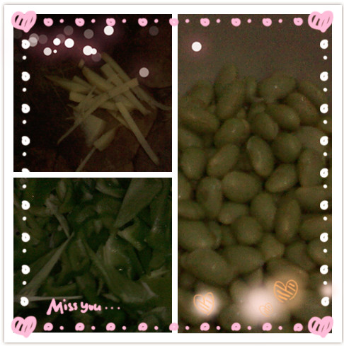 将毛豆粒洗好,把青椒削成条状,姜切丝备用。家里没有葱了%>_<% 把鸡蛋打入碗中,记得一定要加点水进去在搅拌。这样煎出来的鸡蛋不会老吃起来嫩嫩的口感特别好哦!