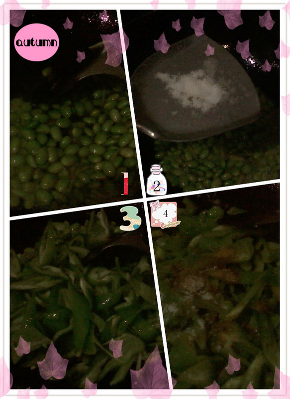 因为毛豆较生所以先下锅,待毛豆粒变色可以加点盐,是为了毛豆粒 可以更入味。翻炒几下可以加入青椒,接着可以加点十三香,味精,少许盐。