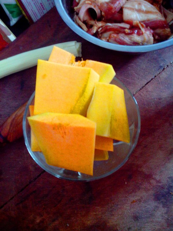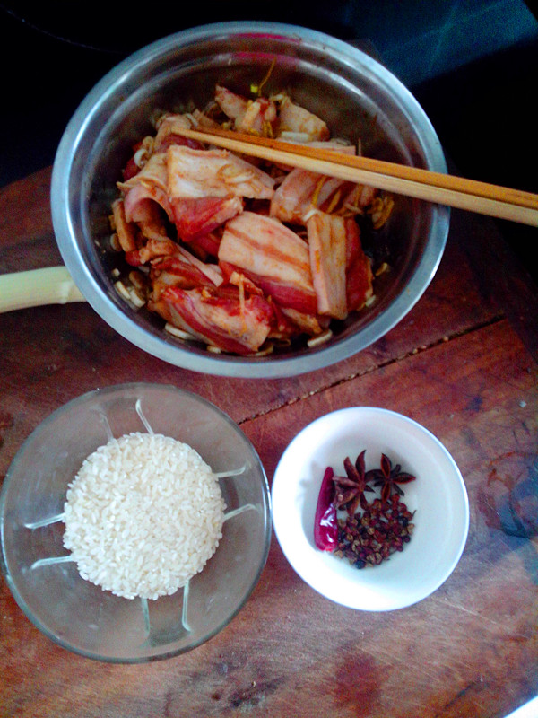 食材:大米;(干辣椒、花椒、八角适量)料酒、生抽、酱油、鸡精、糖,葱姜蒜适量;五花肉;南瓜