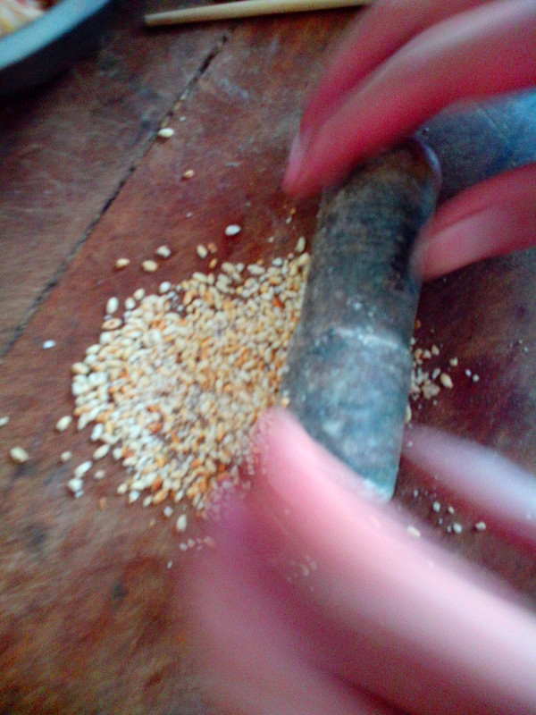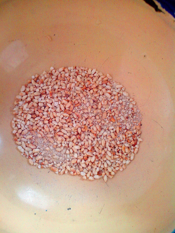 3、然后放1放在案板上,稍用力把炒米碾压,不要太碎(也可以把里面的配料挑出)