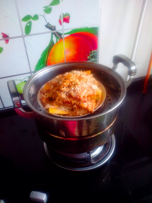 5、将南瓜和双面都沾有米粉的五花肉间层搁放在碗里,上锅蒸四十分钟左右即可