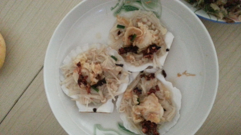 制作:蒸锅做水烧开,将泡好的粉丝及控干的金针菇分别盘入扇贝壳中,然后将贝肉放在其上,均匀地把蒜泥及油淋在贝肉及粉丝和金针菇上,待水开后将扇贝小心地摆好(注意不要倾斜,否则蒸扇贝那鲜美的汤汁就会淌出),盖好锅盖蒸制5-6分钟。蒸好取出后,香葱切沫点缀在贝肉上,热少许食用油,待油温达7、8成热后用小勺浇在贝肉上,然后一股浓郁的鲜味就扑鼻而来,美味啊。(黑色是蒜蓉炒糊了
