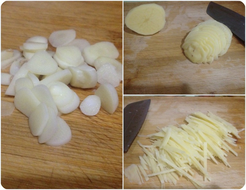 原料:土豆、老陈醋、蒜、盐 我做菜不喜欢放那么多的调料,能用盐搞定的就不放其他的了。本想放点葱,结果家里没有了,就不放了,不影响口感。 1.将土豆洗干净,削皮,先切片,再切成丝,将蒜切成蒜片。贝贝本想帮我削皮,试了试,太硬,不好削,作罢了。