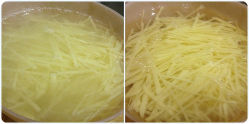 2.将切好的土豆丝放进水里,土豆中含有大量的淀粉,如果不放进水里,炒的过程中会很粘锅。图片是对比,右图是洗了两次的土豆丝,放在水里很清澈了。