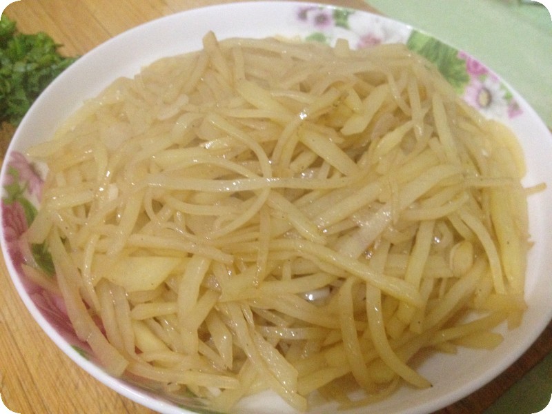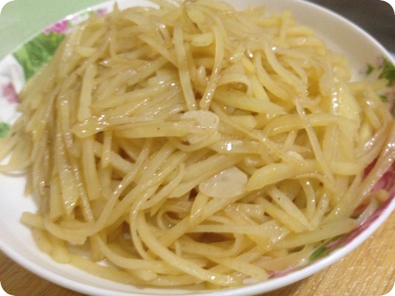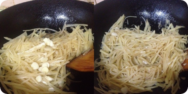 3.锅里放入适量的油,油热后,将土豆丝放进去,注意,最后炒出来的土豆丝脆的秘诀就在这里,土豆丝倒进锅里翻炒两下立刻加入老陈醋,倒入迟了会影响脆的程度,如果爱吃面的土豆丝就不着急了,呵呵。蒜片其实在最后出锅的时候放最出味,但是贝贝爱吃,就得提前放了将蒜炒熟,不然会有辣味。翻炒的过程中放入适量的盐,炒熟出锅即可。