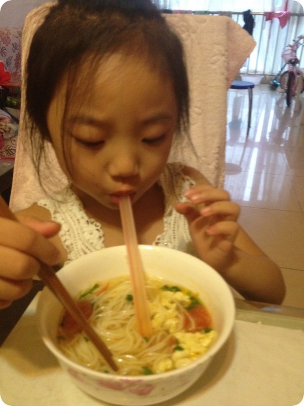 再附一张俺们吃面的照片,哈哈,用筷子吃面条,用吸管喝汤!