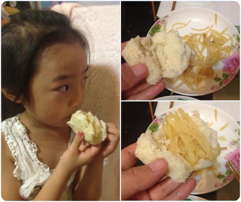 好了,美味的土豆丝出锅啦!贝贝和我一样,很爱吃,还直言妈妈炒的很好吃。那天做了她爱吃的汤面,就没热馒头,谁知菜上桌后,小家伙又嚷嚷还要吃馒头加土豆丝吃,赶紧又给热馒头。这一碗汤面就着土豆丝下肚,还吃了一小块夹着土豆丝的馒头,终于心满意足了。