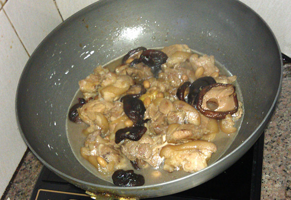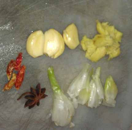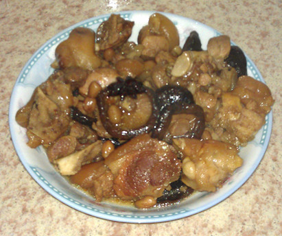 原料:猪脚 半只,花生、香菇、葱、姜、蒜,白糖、料酒适量,