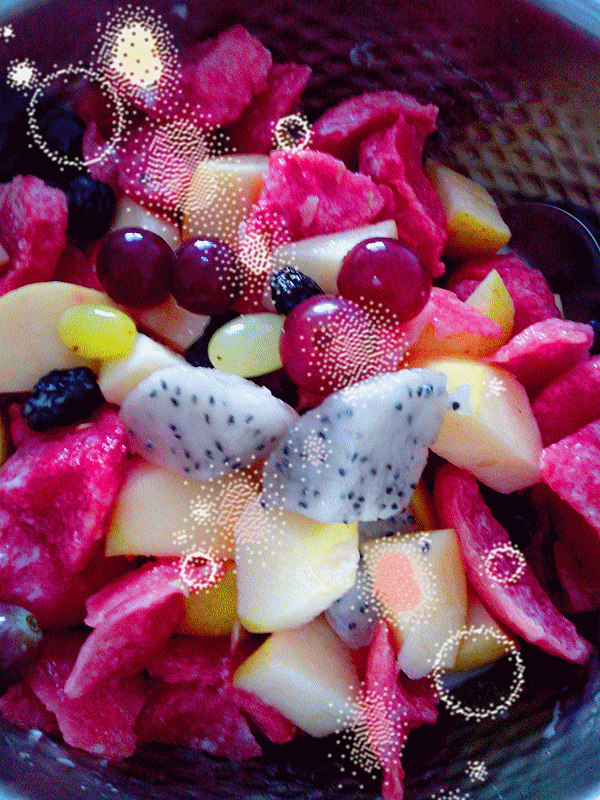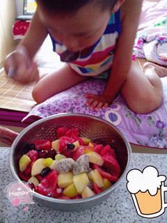 第三个就是配餐准备的开胃水果拼盘了。夏季人容易脱水也容易肝火旺,而这个季节也是水果上市的好时节,为了让家人在蔬果上面跟得上补充,我时不时地准备个水果沙拉什么的,让大家开开胃,开开心。当然食材方面自己拿定,苹果、桃子、火龙果、哈密瓜、椰子汁、葡萄等等都可以选择的,外加酸奶或者有机奶或者什么饮料的也可以;当然把黄瓜等放进去也不错呀!