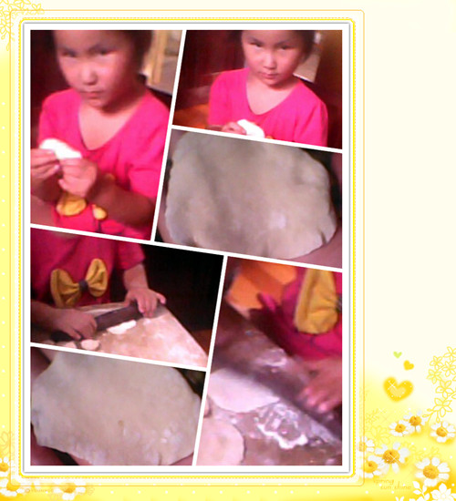 因为我的技术问题,婆婆赶了一达的饺子皮我都忙不过来了。婆婆就过来帮我一起包,这时楠楠就坐到奶奶的位置上去了赶起了饺子皮了。看她还蛮认真的,瞧瞧她赶的皮子虽然不是太圆,但知道她是很认真很用心的赶已经很让我开心了。