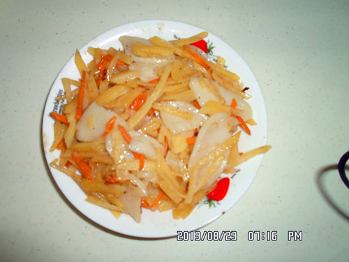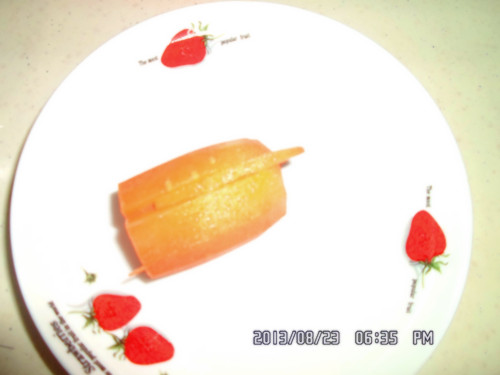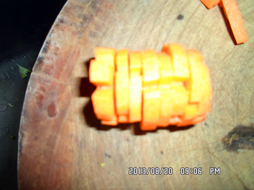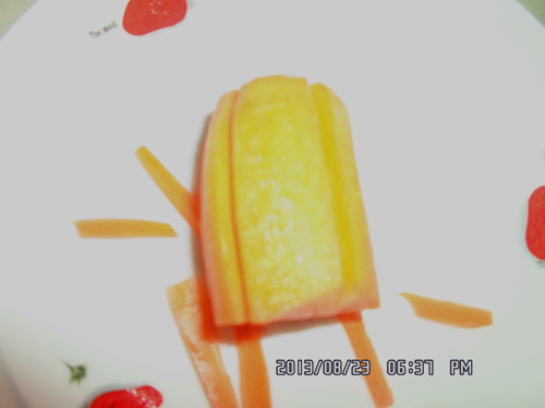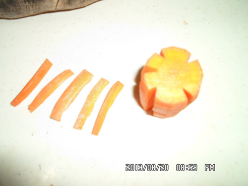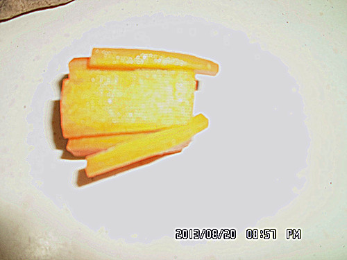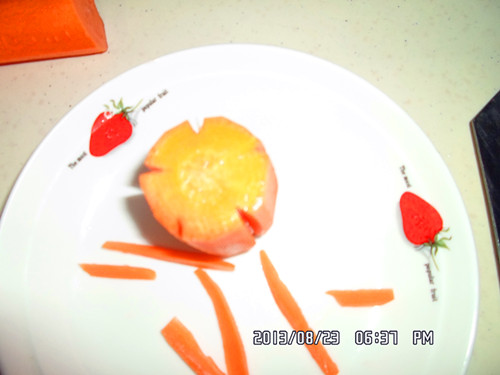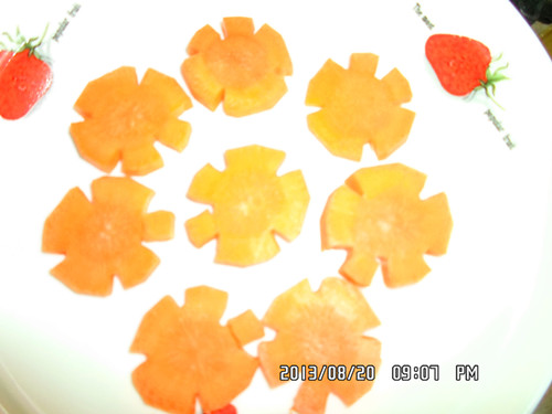切出来的雪花状就比较不好看哦。 间距不等的话有时切成片那个花瓣会断开哦, 这样就不好看了。 希望以上的步骤对于想学切红萝卜花片的亲有所帮助哦。 当然了亲也可以根据不同的菜搭配不同形状的哦, 如马铃薯切成丝,相应的胡萝卜也要切成丝状的, 马铃薯切成菱形的,胡萝卜也要相应切成菱形的图案哦。