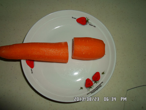 首先要挑那种粗细较均匀的胡萝卜, 用刨刀去皮,把萝卜切成段, 可以根据自己做菜的需要来决定长短, 想要多放一些长度就得长一点哦。