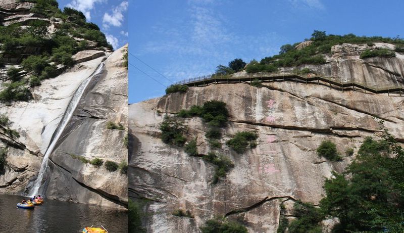 每人40元门票,刚进去的时候有点小失望,尽管看到了瀑布直泻而下,水流清澈,但是号称“第一”也实在说明北京缺水,误以为景区不大,只是这视野所及的一方山水。 继续往里走,却觉别有洞天,时而峭壁间铁板搭路,时而石板台阶略显陡峭,两侧植被丰富,大甲虫、小蜥蜴、红蜻蜓,突然你就发现眼前“倏”的一下有什么跑过。