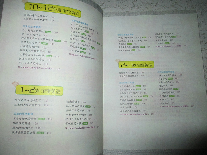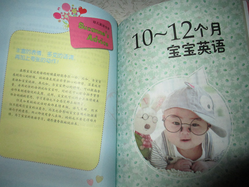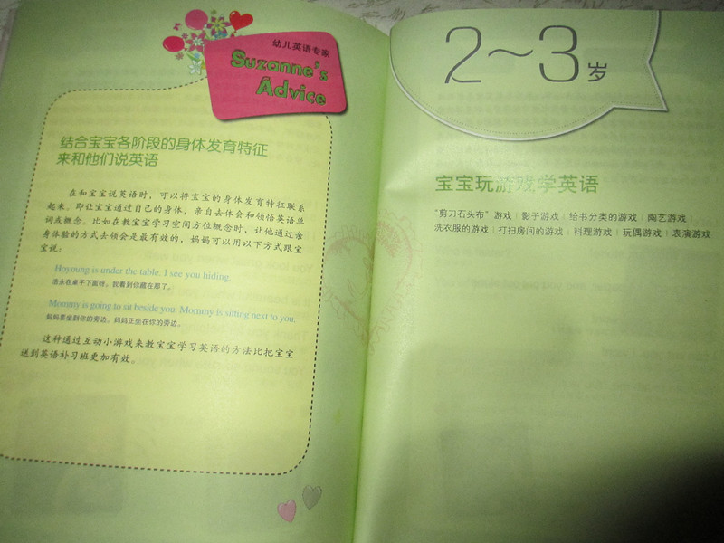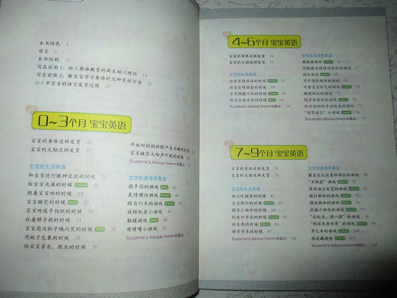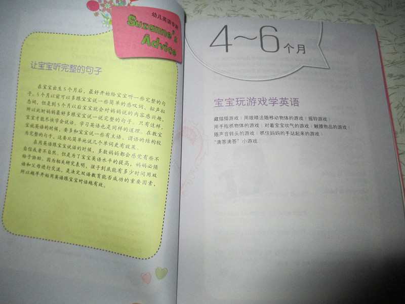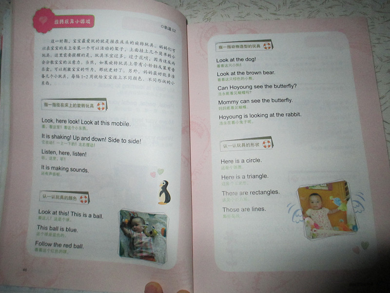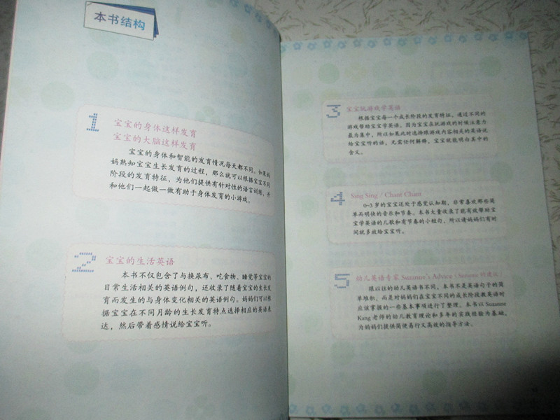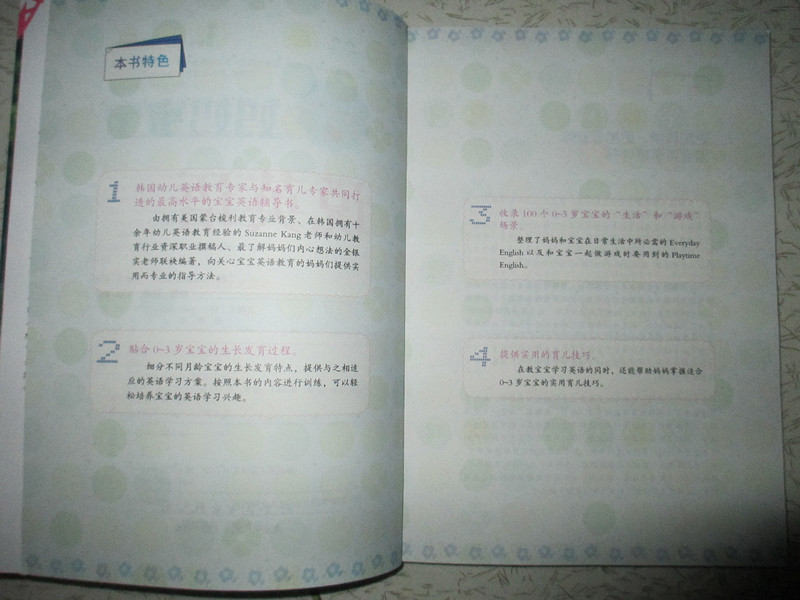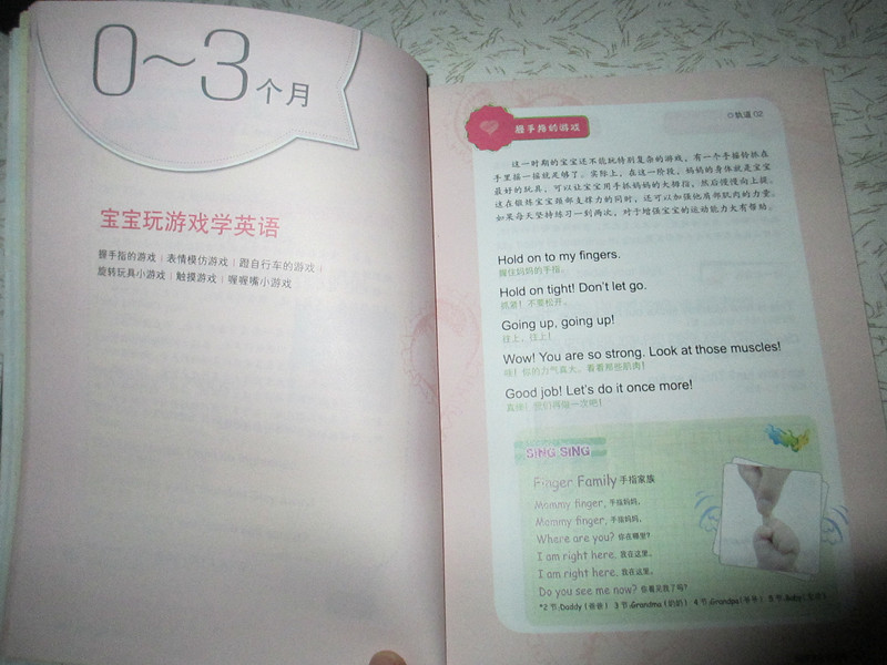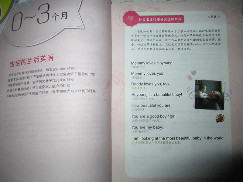 ![]() 《妈妈宝宝说英语》这本书是世界图书出版公司出版,由韩国的金银实编著的一本妈妈和宝宝在日常起居中和孩子说英语的书。这本书介绍了0-3岁宝宝在不同阶段的发育特征,收录了日常生活及游戏中必需的英语句子,并且同时还提供了最实用的育儿技巧。另外,本书还有一张配套光盘,里面有50余首经典英文儿歌。 ![]() 将育儿技巧和说英语结合在一起,这样的书我还是第一次见。让我们赶紧翻开此书,一起来看看这个韩国的知名育儿专家编著的《妈妈宝宝说英语》吧。 本书有四大特色: 1. 韩国幼儿英语教育专家与知名育儿专家共同打造。 2. 贴合0-3岁宝宝的生长发育过程。 3. 收录100个0-3岁宝宝的“生活”和“游戏”场景。 4. 提供实用的育儿技巧。 ![]() 从这详细的目录里可以看出,本书不是单纯去说英语,而是将英语渗透进孩子生活的点点滴滴当中,从衣食住行、吃喝拉撒的各个层面,全面掌握生活和游戏英语。 ![]() ![]() 本书对于如何教孩子说英语,还有很多针对家长的建议和理论。 ![]() 如何进行双语教育?与宝宝的发育过程相适应的学习方法:给宝宝听与其发展阶段相适应的英语。 那么,如何教宝宝有效地学习英语呢?本书列举了5种有效的方法: 1. 在家中各处贴上英语卡片 2. 要像唱歌一样有节奏感地说英语给宝宝听。 3. 即使英语不熟练也要亲自说给宝宝听。 4. 多和宝宝进行眼神交流。 5. 经常叫一叫宝宝的名字。 ![]() 下面是正文内容,按宝宝的年龄段,将此书分为几个部分具体介绍。每个年龄段都有如下的内容: 1. 此阶段宝宝的语言发育过程 2. 宝宝的身体这样发育 3. 宝宝的大脑这样发育 4. 此阶段宝宝的生活英语 5. 宝宝玩游戏学英语 6. 幼儿英语专家金银实的建议 ![]() 先从0-3个月的宝宝开始: ![]() ![]() ![]() ![]() ![]() ![]() ![]() 4-6个月的宝宝英语 ![]() ![]() 7-9个月宝宝英语 ![]() ![]() 10-12个月宝宝英语 ![]() ![]() ![]() 1-2岁宝宝英语 ![]() 2-3岁宝宝英语 ![]() ![]() ![]() ![]() 对于我来说,很多生活场景还真不知该如何用英语表达,尤其是换尿布啊,把尿啊,诸如此类的平日不怎么说的场景,读了此书受益很多。虽说敬仪已经过了0-3岁这个年龄,关于书中如何护理、如何带宝宝做游戏这些方面我们用不上了,但无所不在的生活和游戏场景中的英语是我们需要不断学习的。所以此书适合0-3岁,只是针对生活护理方面而言,对于学英语来说,是没有年龄界限的。 本作品未经作者许可不得转载,转载请征求作者意见。擅自转载使用,将保留追究其法律责任的权利! 评分记录