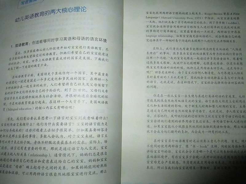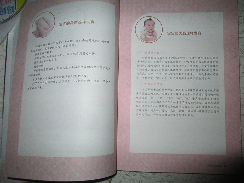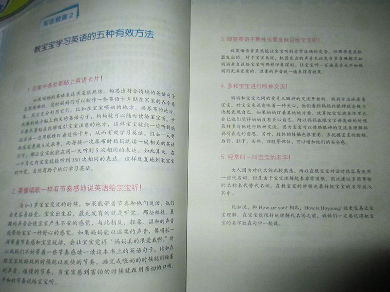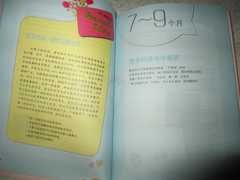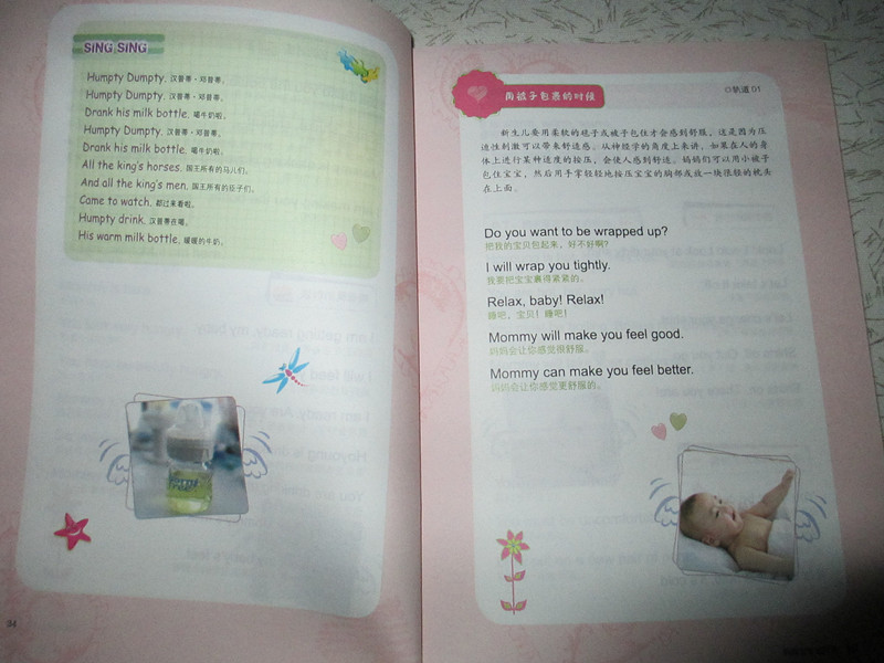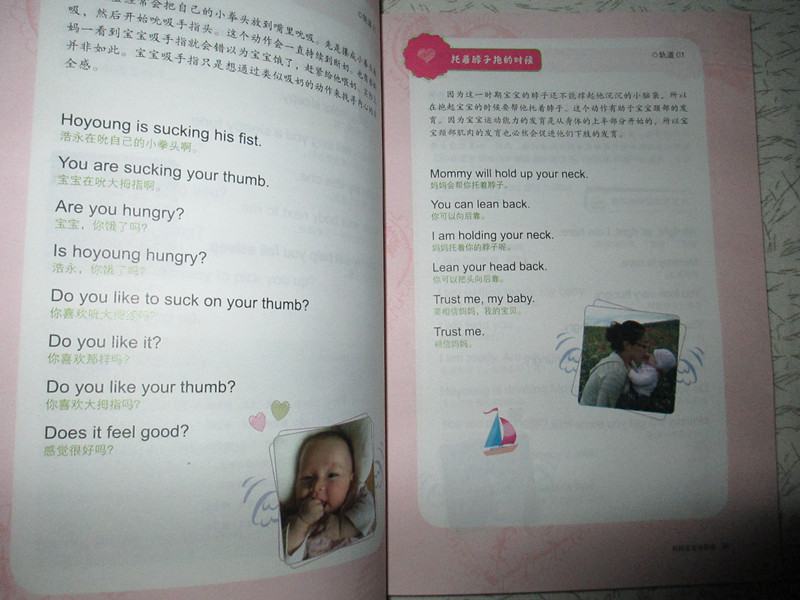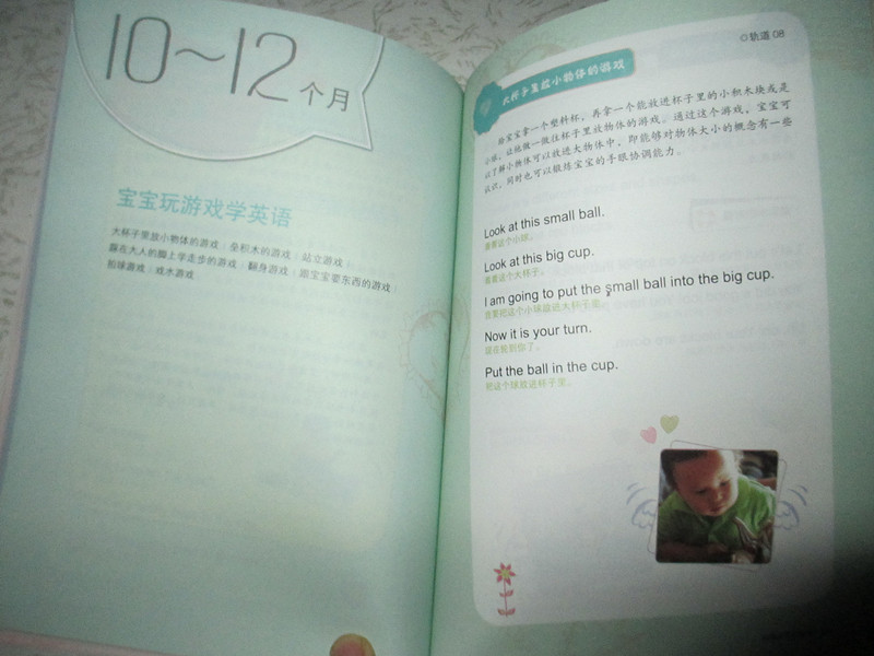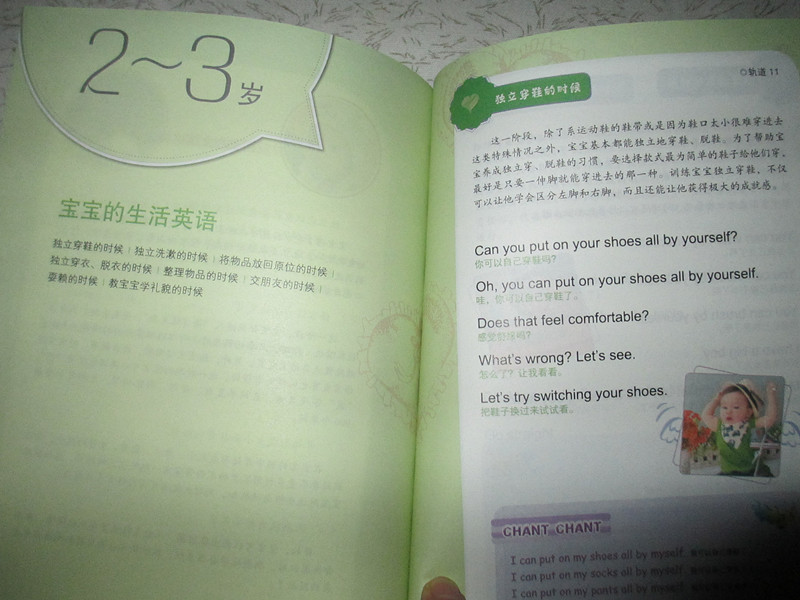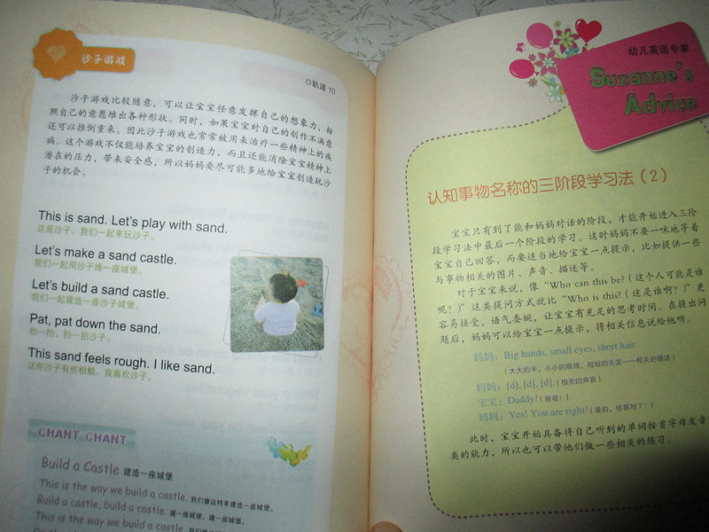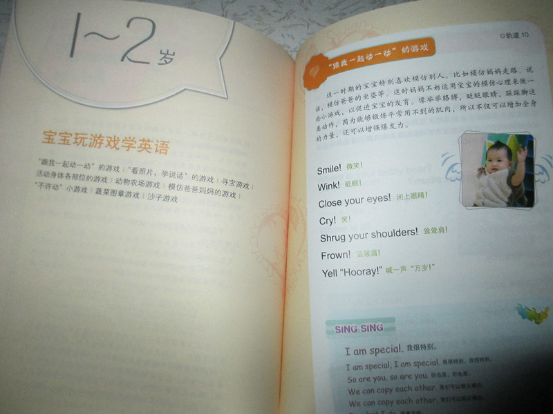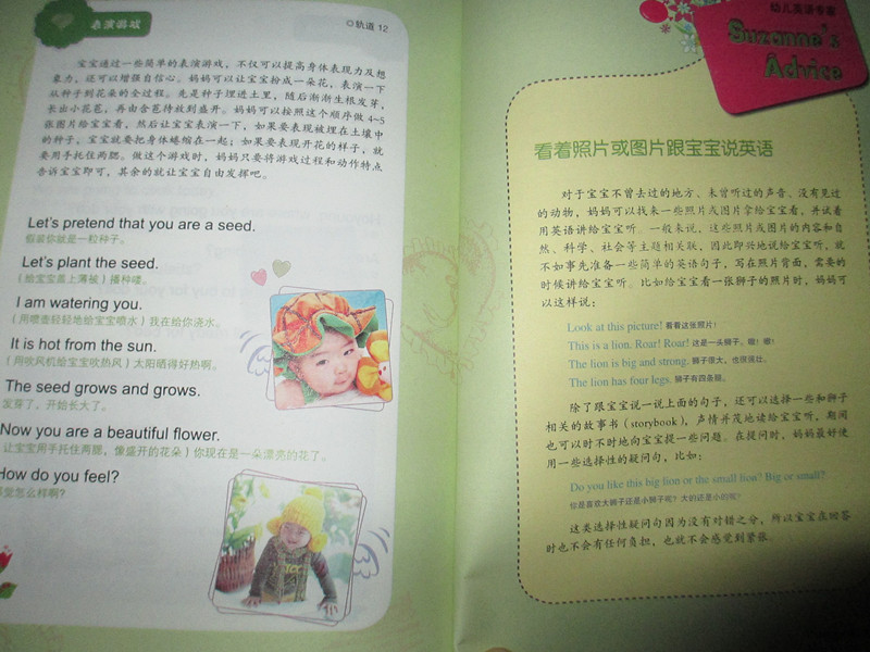 ![]() 《妈妈宝宝说英语》这本书是世界图书出版公司出版,由韩国的金银实编著的一本妈妈和宝宝在日常起居中和孩子说英语的书。这本书介绍了0-3岁宝宝在不同阶段的发育特征,收录了日常生活及游戏中必需的英语句子,并且同时还提供了最实用的育儿技巧。另外,本书还有一张配套光盘,里面有50余首经典英文儿歌。 ![]() 将育儿技巧和说英语结合在一起,这样的书我还是第一次见。让我们赶紧翻开此书,一起来看看这个韩国的知名育儿专家编著的《妈妈宝宝说英语》吧。 本书有四大特色: 1. 韩国幼儿英语教育专家与知名育儿专家共同打造。 2. 贴合0-3岁宝宝的生长发育过程。 3. 收录100个0-3岁宝宝的“生活”和“游戏”场景。 4. 提供实用的育儿技巧。 ![]() 从这详细的目录里可以看出,本书不是单纯去说英语,而是将英语渗透进孩子生活的点点滴滴当中,从衣食住行、吃喝拉撒的各个层面,全面掌握生活和游戏英语。 ![]() ![]() 本书对于如何教孩子说英语,还有很多针对家长的建议和理论。 ![]() 如何进行双语教育?与宝宝的发育过程相适应的学习方法:给宝宝听与其发展阶段相适应的英语。 那么,如何教宝宝有效地学习英语呢?本书列举了5种有效的方法: 1. 在家中各处贴上英语卡片 2. 要像唱歌一样有节奏感地说英语给宝宝听。 3. 即使英语不熟练也要亲自说给宝宝听。 4. 多和宝宝进行眼神交流。 5. 经常叫一叫宝宝的名字。 ![]() 下面是正文内容,按宝宝的年龄段,将此书分为几个部分具体介绍。每个年龄段都有如下的内容: 1. 此阶段宝宝的语言发育过程 2. 宝宝的身体这样发育 3. 宝宝的大脑这样发育 4. 此阶段宝宝的生活英语 5. 宝宝玩游戏学英语 6. 幼儿英语专家金银实的建议 ![]() 先从0-3个月的宝宝开始: ![]() ![]() ![]() ![]() ![]() ![]() ![]() 4-6个月的宝宝英语 ![]() ![]() 7-9个月宝宝英语 ![]() ![]() 10-12个月宝宝英语 ![]() ![]() ![]() 1-2岁宝宝英语 ![]() 2-3岁宝宝英语 ![]() ![]() ![]() ![]() 对于我来说,很多生活场景还真不知该如何用英语表达,尤其是换尿布啊,把尿啊,诸如此类的平日不怎么说的场景,读了此书受益很多。虽说敬仪已经过了0-3岁这个年龄,关于书中如何护理、如何带宝宝做游戏这些方面我们用不上了,但无所不在的生活和游戏场景中的英语是我们需要不断学习的。所以此书适合0-3岁,只是针对生活护理方面而言,对于学英语来说,是没有年龄界限的。 本作品未经作者许可不得转载,转载请征求作者意见。擅自转载使用,将保留追究其法律责任的权利! 评分记录