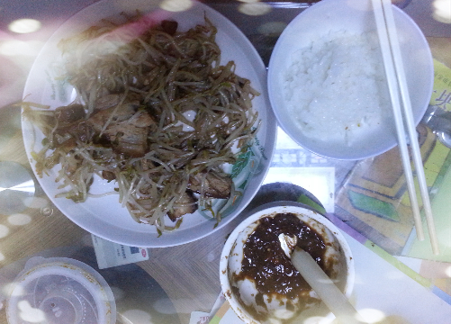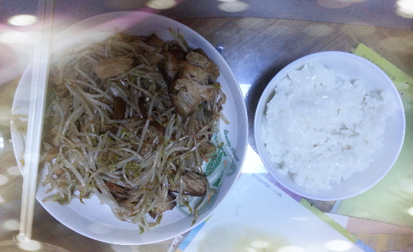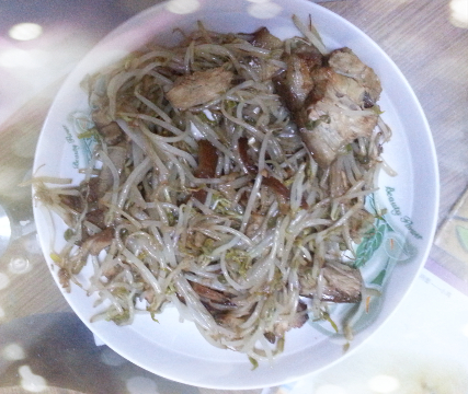我在锅里放了点油,然后葱花,然后把肉放进去,迸出来的油溅到胳膊上,有点疼,我赶紧把豆芽扔进去,翻炒了几下,放了点盐,盖上锅盖。很快就炒好了。看看我的晚餐吧。