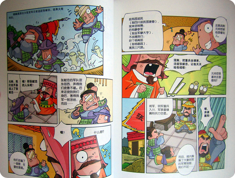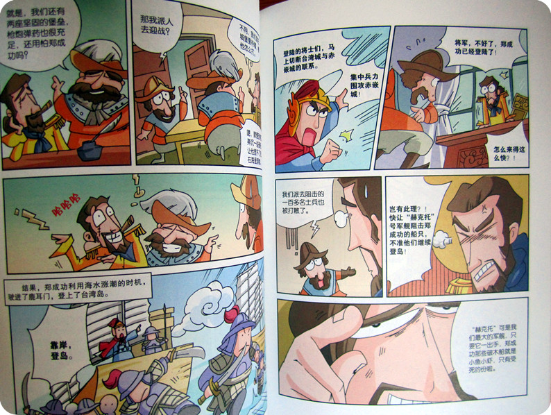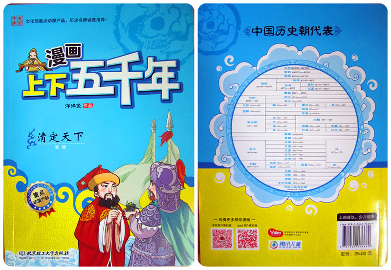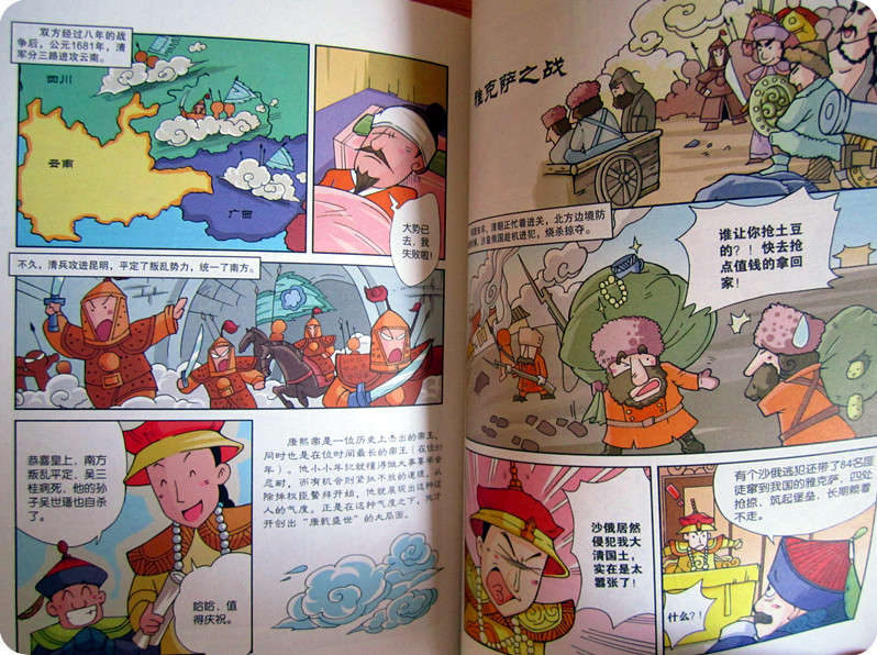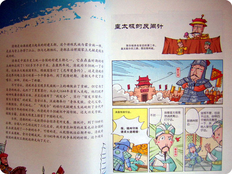《上下五千年》我想应该是每个孩子必备的书吧。家里已经收藏了一套纯文字版的《上下五千年》,书不错,真不错,可现在的小娄不喜欢看,也许是还读不懂其中的乐趣吧。所以我也没有强求,可这次申请到的这本《漫画上下五千年》却得到了小娄的偏爱。几次看到小家伙翻着书,美滋滋的乐。喜欢的不得了! 细细的看看《漫画上下五千年》我就明白了,它受到孩子欢迎的原因了。生动活泼的漫画配上幽默的语言,让每个历史瞬间看上去都是那么的有趣新鲜!别说孩子,就是作为父母的我们也被深深的吸引了。 我们这次有幸读到了《漫画上下五千年之清定天下》,这本书中包含了与清朝相关的13个历史故事和人物故事。【皇太极的反间计】【闯王李自成】【大希望张献忠】【吴三桂借清兵】【洪承畴降清】【史可法守扬州】【郑成功收复台湾】【李定国坚持抗清】【康熙平定三藩之乱】【雅克萨之战】【康熙亲征噶尔丹】【曹雪芹写《红楼梦》】【大贪官和珅】,每个故事都很精彩,曾经让人觉得无比枯燥的历史,居然也可以如此有趣,想象下,如果在N年之前,我就看过如此生动的历史读物,相信我的历史也不会那么差劲了!真心的羡慕现在的孩子啊!有这么多的好书可以读,可以看,可以如此轻松的学历史。 其实在读到这本书之前,我对漫画还是抱有一些质疑的。尤其是对孩子看漫画有所顾虑。可看到这本书,我懂了,只要是好的内容,健康的,有趣的,用漫画的形式来讲述真是不错的!这样的方式孩子更容易接受,也更喜欢。只有喜欢了才能真正的愿意去接触,才能融入其中。很庆幸,我及时发现了《漫画上下五千年》。