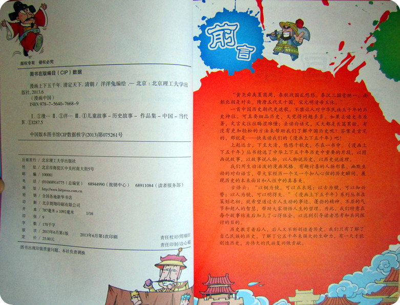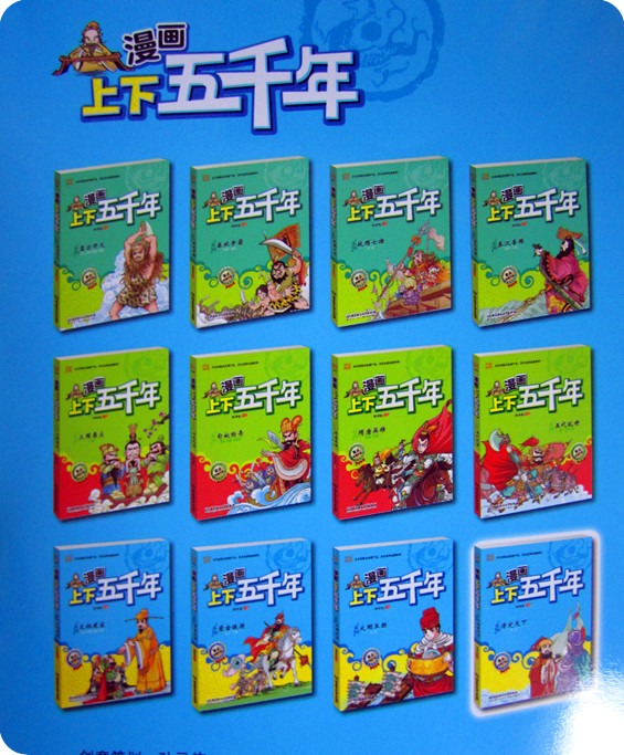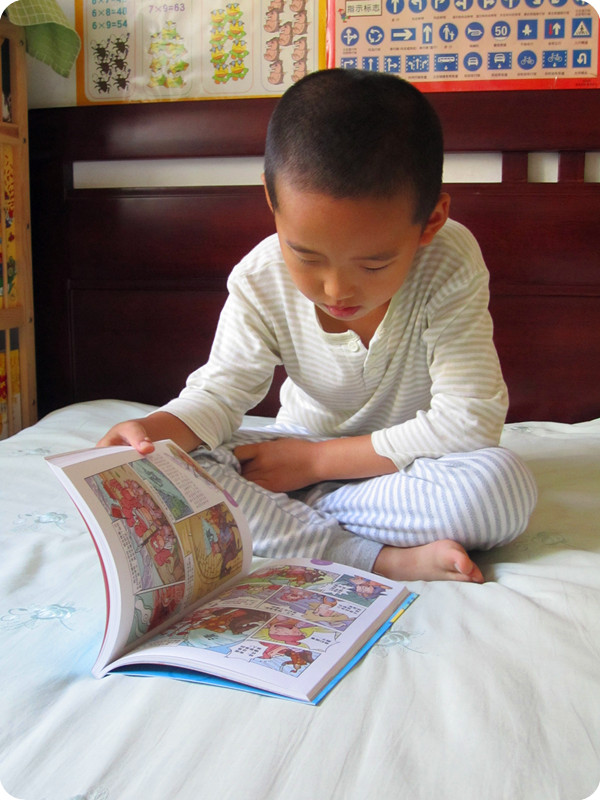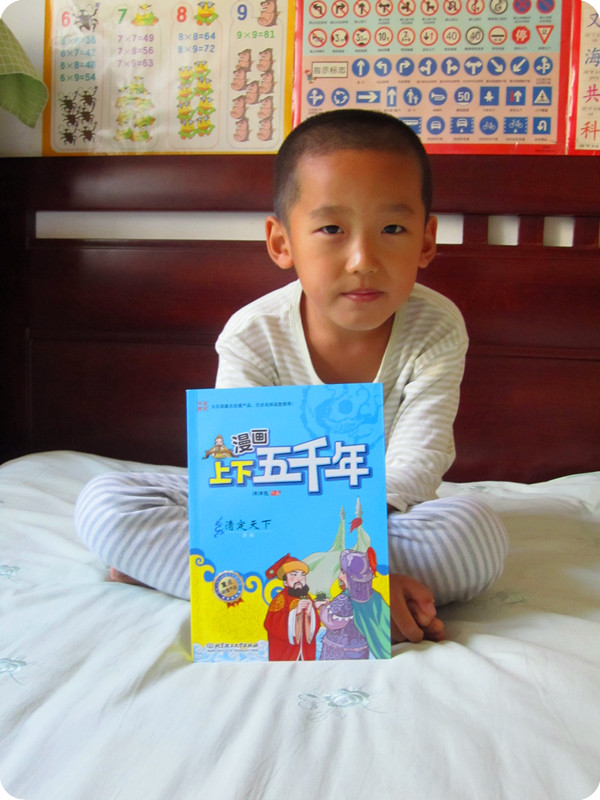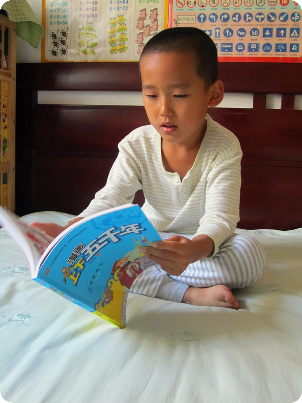 夸张的表情,可爱的造型,是不是很吸引眼球啊?!呵呵……真的是越看越喜欢!!相信所有的孩子都会喜欢的! 用孩子的方式给孩子讲故事,我想这是这套书最为成功之处。历史故事书随处可见。《上下五千年》的版本也不是一两种。而这套书一定是最能抓住孩子眼球的,因为这是为孩子们量身定制的,是最适合孩子们的! 虽然这书是为孩子们打造的,可要想看懂这本书也不容易,怎么也得有点识字量吧!我认为这本书实在不适合亲子阅读,还是让小家伙们独享吧!由眼入脑入心,那会是一个段快乐的时光旅程! 这套《漫画版上下五千年》推荐给6岁以上能够独立阅读的小朋友们!不要太着迷哦! 附宝贝读书照