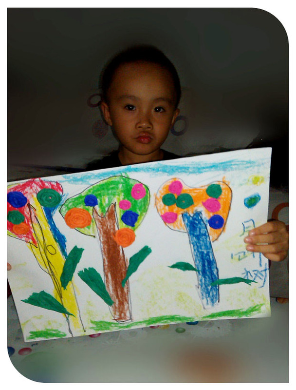 我们要制作的主题是月饼树,妈妈把这个想法跟谦谦讲了,还告诉他中秋节吃月饼是非常开心快乐的事情。我们做团团圆圆的月饼树吧,接下来画树的人物就交给小家伙独立完成吧。 谦谦画了三棵树,代表着一家三口,然后涂色。小家伙画画全凭自己所感,妈妈不参与任何意见,孩子怎么想就怎么画。谦这树的颜色涂的也是五颜六色的,最后小家伙还画了蓝天和绿地,总的说来看起来不错。