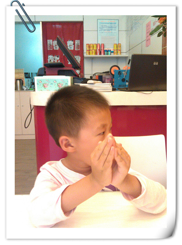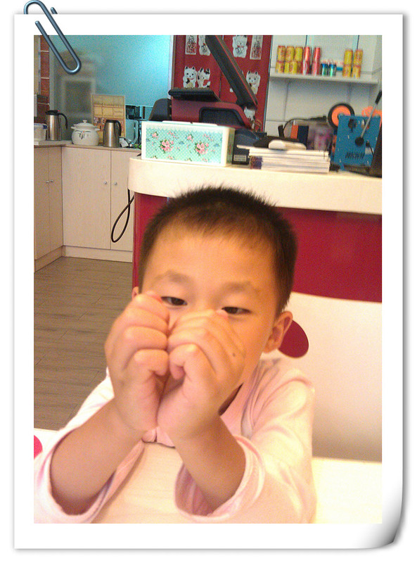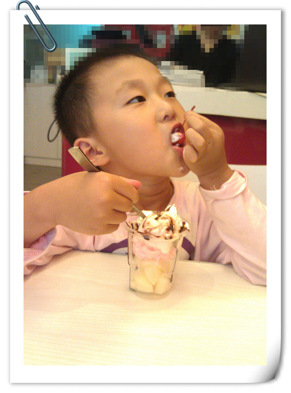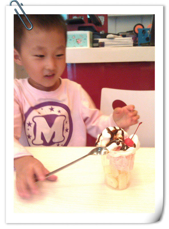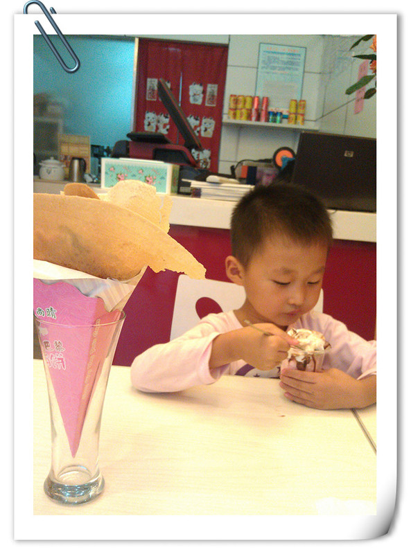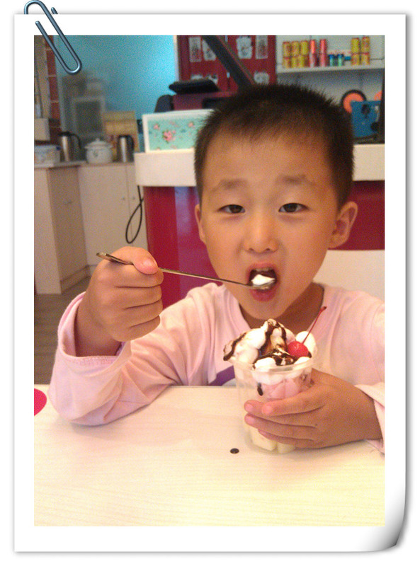 我们坐在座位上等着可丽饼上来,点点就对着镜子做鬼脸,一会儿还做手势,对着镜子看,很可爱的样子。冰激凌上来了,点点先看了一下,真漂亮的,先吃了一口冰激凌,又小心翼翼的拿起了一个樱桃吃起来,真有意思。