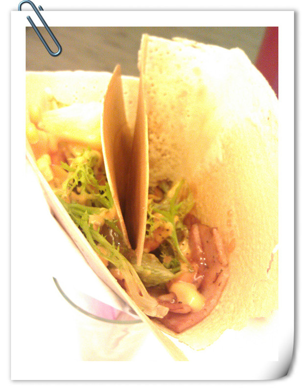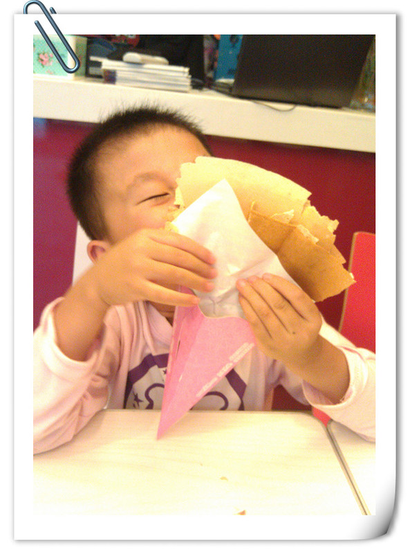 好不容易等到可丽饼上来了,点点就想快点吃冰激凌了,可以早点吃可丽饼,可丽饼的装扮很漂亮,是放在一个圆锥形的被子里面的,包裹的也很有意思,三角形的,里面有蔬菜,水果,色拉,培根,营养很丰富。