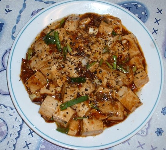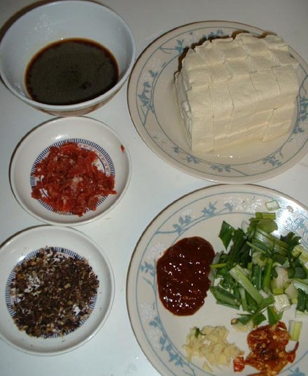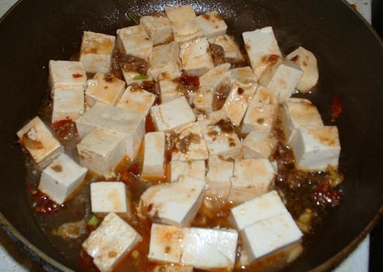 不过后来还是决定自己做..怎么说也卫生些..料也能扣得住.. 本来是想用牛肉做配料的..家里只有猪肉..哈哈..凑合着用了.. 配料:豆腐切丁、猪肉切末、豆瓣酱、盐、酒、干红辣椒碎、青蒜、姜末、花椒粉、水淀粉、酱油、少许糖。 ![]() 锅内加少许油,大火加热,油热后依次加入豆瓣酱、盐、干红辣椒、青蒜、姜末、花椒粉、猪肉末。拌着炒香。。 ![]() 加入切成小块的豆腐。改小火,煮沸。 ![]() 待豆腐熟后,改大火,加入由水淀粉、糖、酒、味精、酱油调好的芡汁。待芡汁均匀附着后,关火,起锅。 ![]() 起锅,撒上花椒面,麻婆豆腐这道菜就这样完成了!