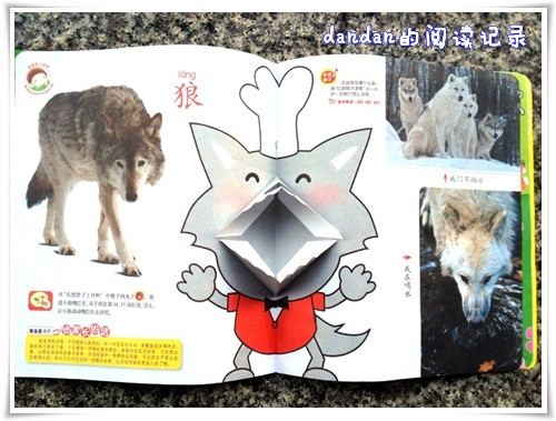 ![]() 阅读日期: 10月4日 参与人员:妈妈和宝宝-- 阅读绘本:《婴儿画报:认识狼》 绘本特色:每期一个动物主题,认识小动物,通过这期画报还学会了红绿灯的动作。 阅读心得: 今天带蛋蛋去了福清,也算是出过福州市了~~~呵呵。 下午比较早到家,跟他一起看了这本画报,不知道这是第几次读这本了,这期画报貌似是他比较喜欢的一本。 这期画报的主要动物是小灰狼,通过小灰狼和妈妈的故事,让宝宝知道灰狼和小狗是不一样的动物。蛋蛋一开始总是把狼认为是狗,并作出很喜爱的样子,所以为了区分,我告诉他灰狼的尾巴是向下的,小狗的尾巴是向上的,灰狼比较凶,小狗比较可爱。现在再看这本画报,他不会把狼叫做狗了~~~ ![]() 在这期画报的中页,还有一只立体的狼,有点儿灰太狼的样子哈~~张着个大嘴巴,露出尖尖的牙齿。 ![]() 这期的最大收获,就是这页红绿灯的做操游戏。三只小灰狼分别穿着三种不同颜色的衣服,并且做出不一样的动作。红衣服的狼双手交叉抱在胸前;黄衣服的狼双手举过头顶;绿衣服的狼则迈着大步向前走。代表了三种信号灯的不同做法。 蛋蛋很快学会了这些动作,并付诸于实践,在路上看到交通灯就要做这个游戏。昨天看的那本小小猫的手拉手,里面的交通灯就让他感到很有亲切感,估计都源自于这本画报吧~~~