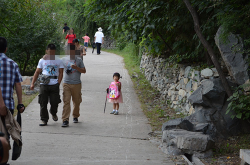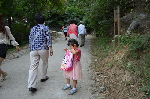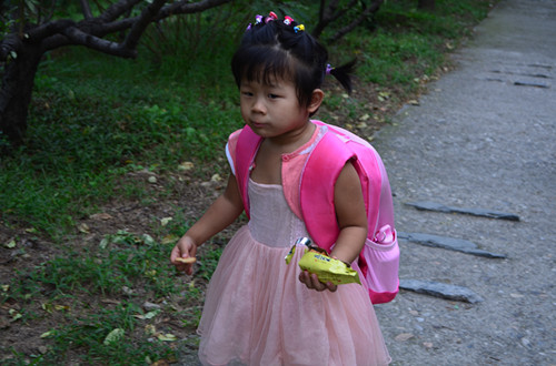 我们开始上山了。嫂子估计看到我一直背着挺累的,而谁的劝说也是无济于事,于是,拿出来杀手锏,薯片。宝宝一看到薯片马上来了精神,立刻表示下来自己走呀。可是拆开包装一看,其实不是薯片,只是酷似薯片的饼干。宝宝背着三叔送的小书包,边吃边走,不过宝宝吃了几口后就不吃了。但是,宝宝没有再让抱抱,那股困意过去了。