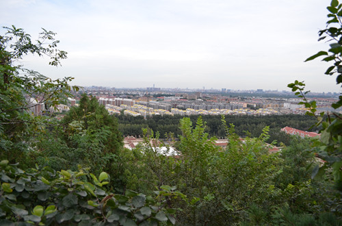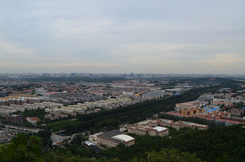 夕阳西下,远处微微泛红,蓝天白云下的北京城。