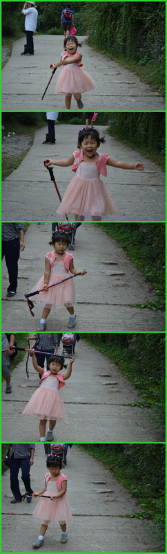 宝宝拿上了登山杖,胸前背着书包,继续登山,感觉像模像样的。